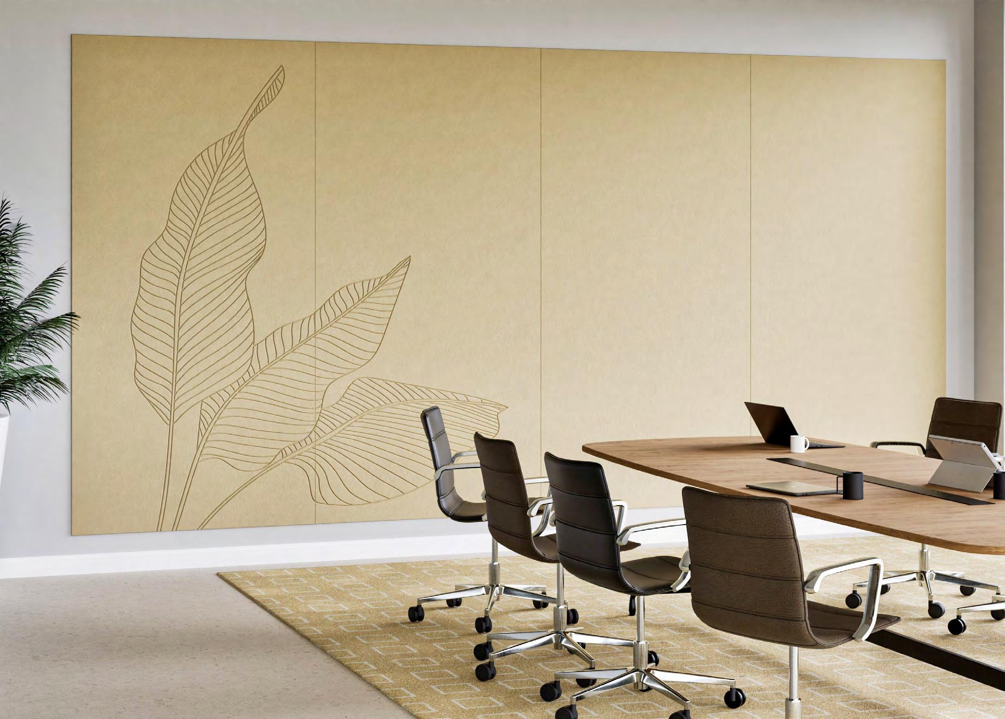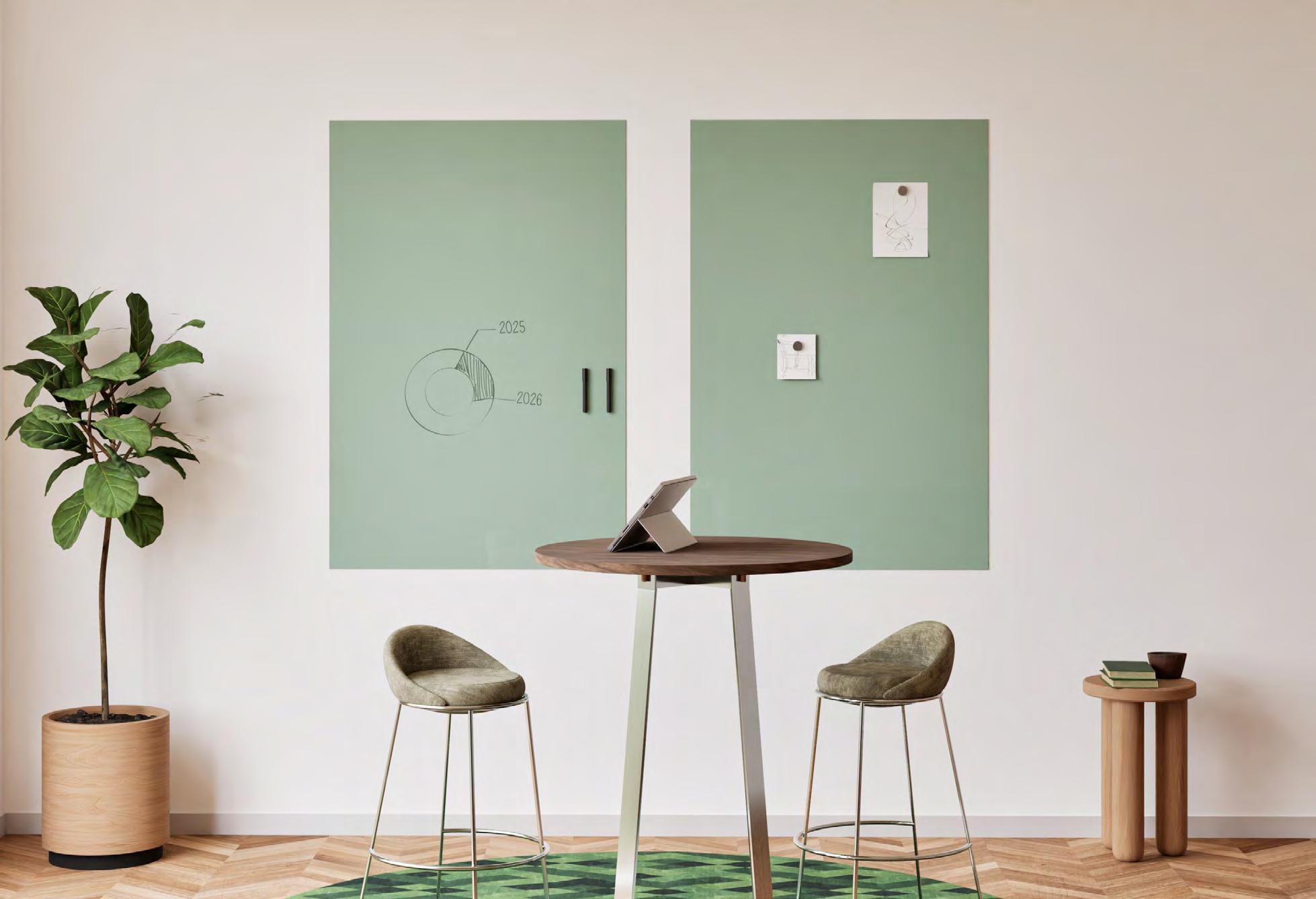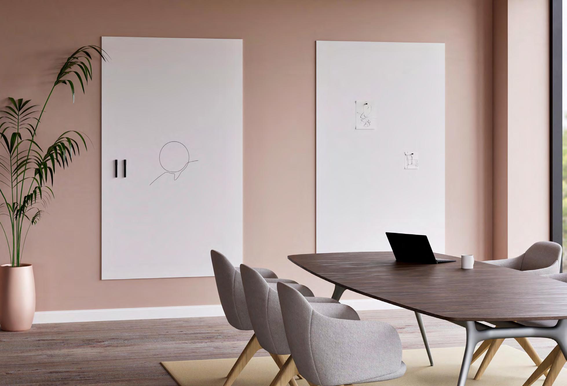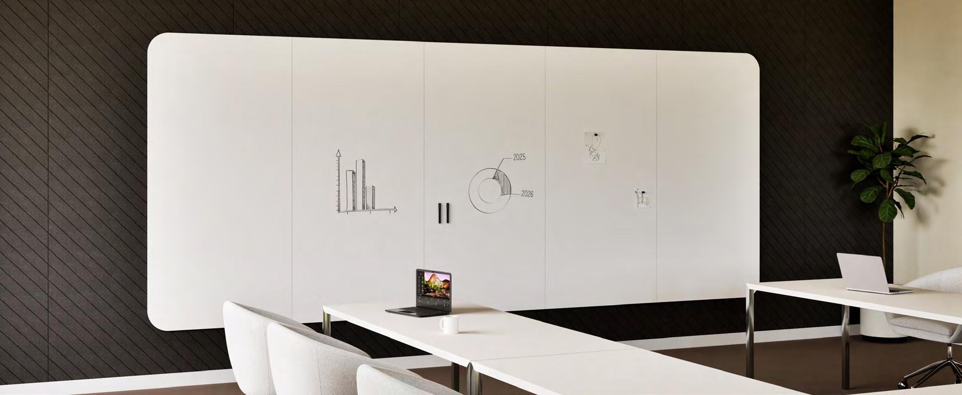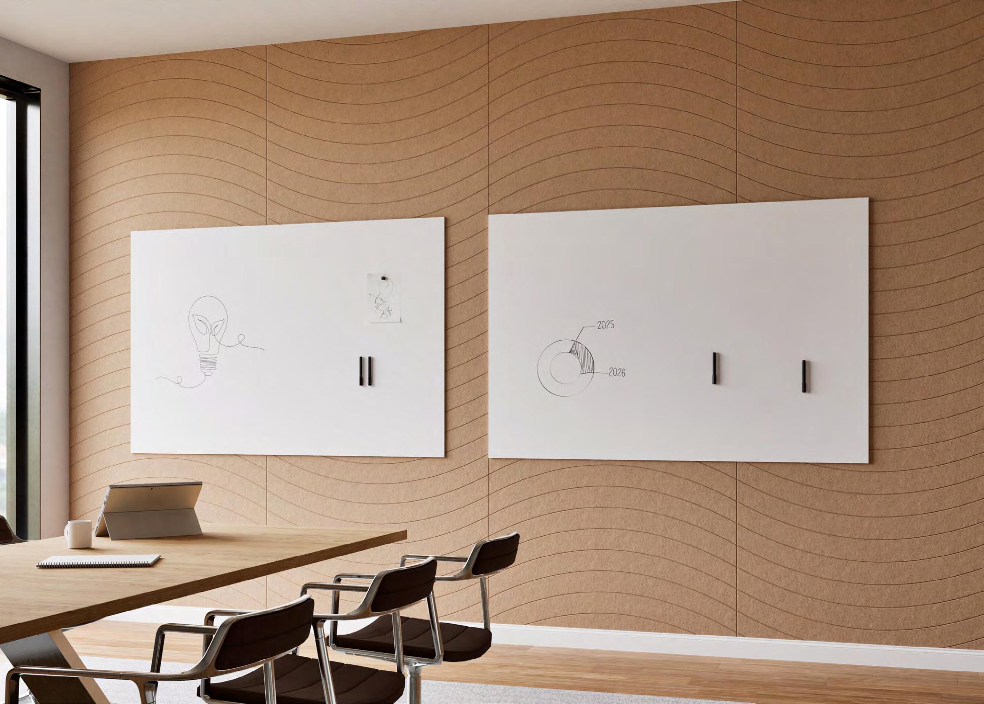Bereik uitstekende akoestiek in kantoor- en schoolgebouwen met één voorgeconfigureerde installatie. Chameleon Wall Coverings Combi is een wandvullend PET-vilten oppervlak dat geluid dempt en tegelijk ruimte biedt om ideeën te delen. Verkrijgbaar in 4 whiteboardconstellaties, diverse maten, patronen (p. 56) en kleuren (p. 40).