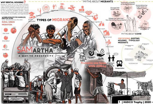 The aim of the design was generating efficient, adequate, sustainable and affordable rental housing options, understanding the brunt of the pandemic borne by poor migrant workers, informally employed people in the work force, offering them an improved quality of life to meet their requirements in a desirable manner. The concept of co-houstng model for rental housing was used where people live In a community and share extended living spaces and basic servtces.