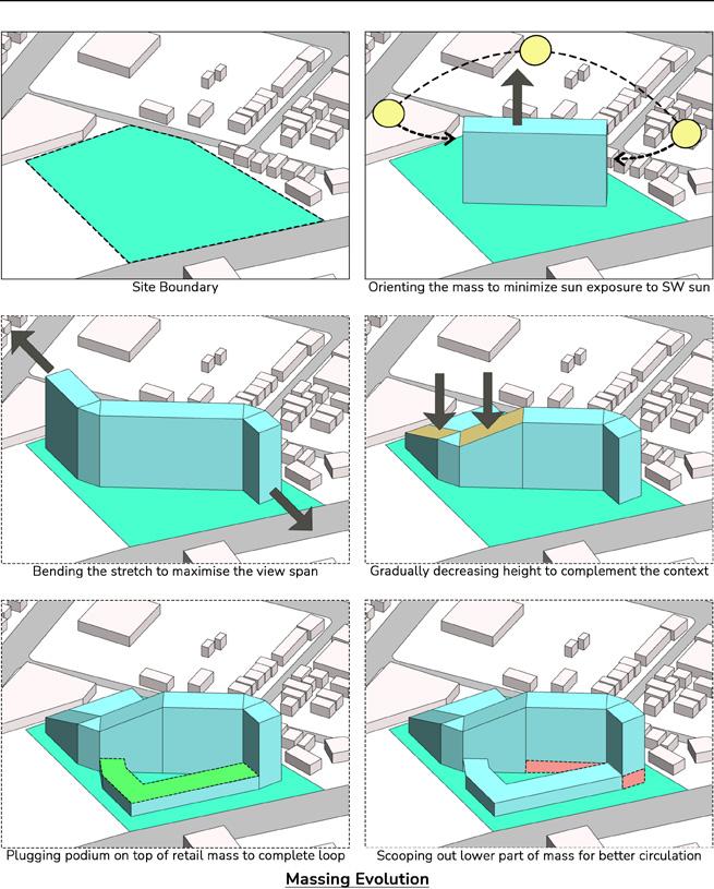 The mixed-use residential commercial apartment in Kolkata was inspired ny “Tetris” formation, where the various permutations of building block unites was arranged on single floor. The commercial retail floors on lower part of building covers the facade, while the orientation of residential towers extend the view to diaginal squares for wind capture. Kolkata being hot and humid enabled the design to naturally sunshade the lower part of building.