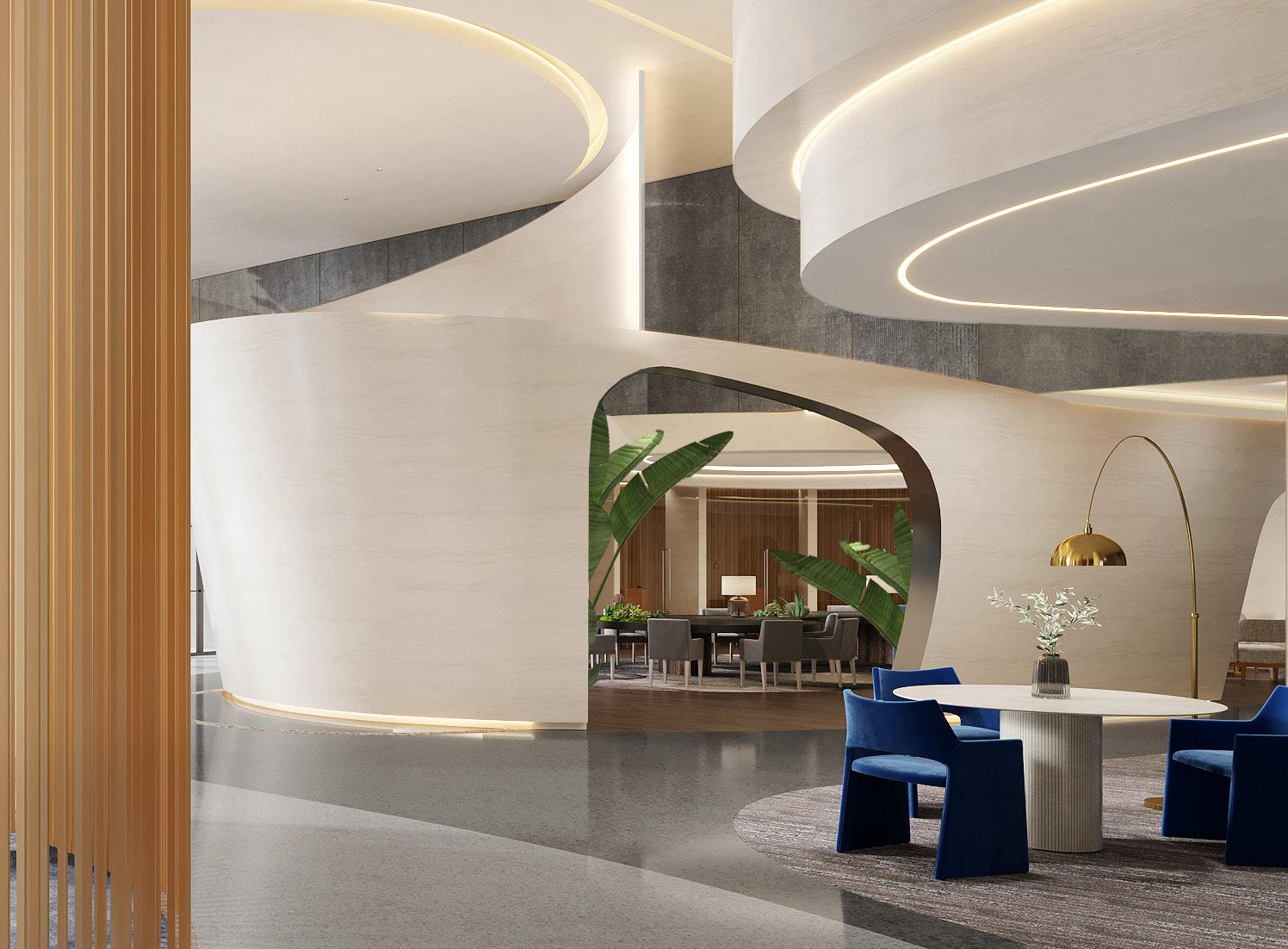 The striking design of the cocoon coworking space, featuring a sculptural form that captivates every guest upon arrival. This oasis in the heart of the lobby boasts unique and unexpected design elements, including an exterior wall crafted as a sculptural ribbon, seamlessly extending from the floor to the ceiling.