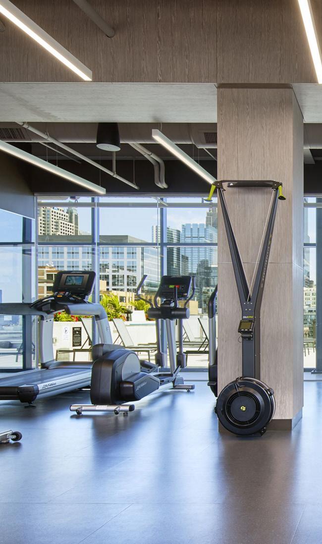 Featured above are images of fitness centers strategically located on the top floor of the building to serve as prime real estate and attract a fitness savvy community. Users enjoy the cityscape views and filtered natural light while working out.