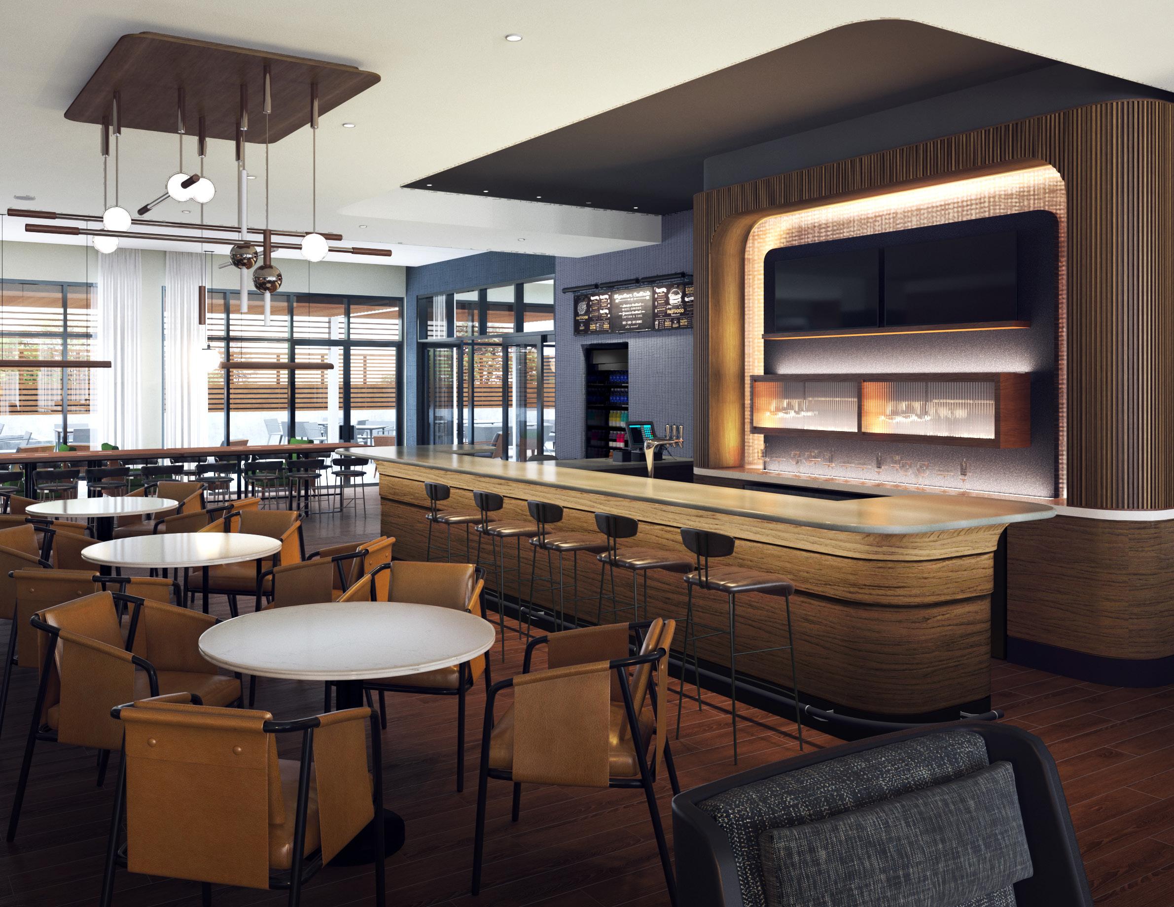 A unique amenity at The Gallery on Wells is Dollop Coffee, located in the main residential entry. Designed to create a fluidity between the residential lobby and the coffee shop, there is a natural flow that results in a casual yet sophisticated interior space. To retain the formality of a residential entrance but distinguish a transition between the spaces, a large entry portal of blackened steel, heavy velvet drapery and decorative floor tile was introduced, which now creates a marked hospitality niche.