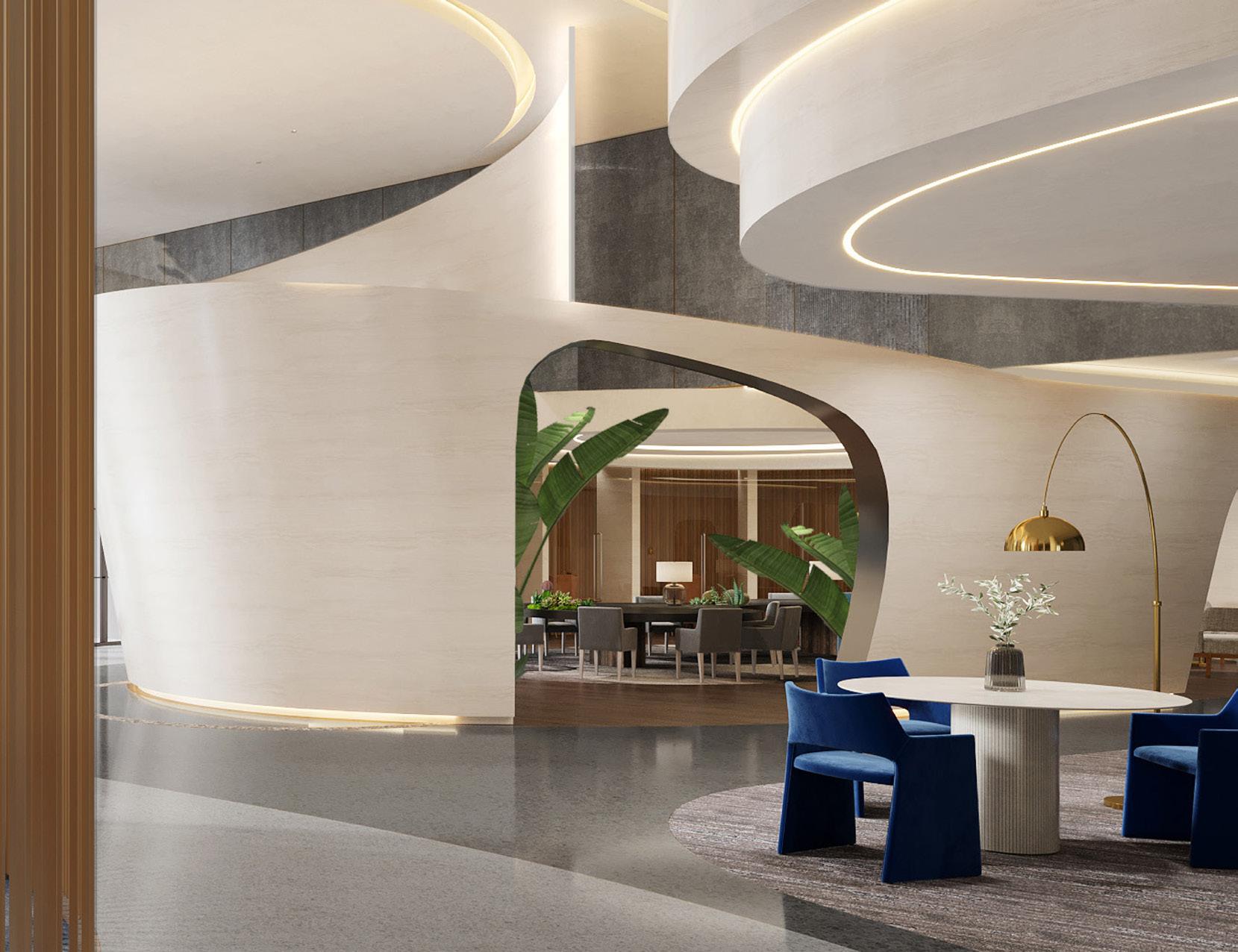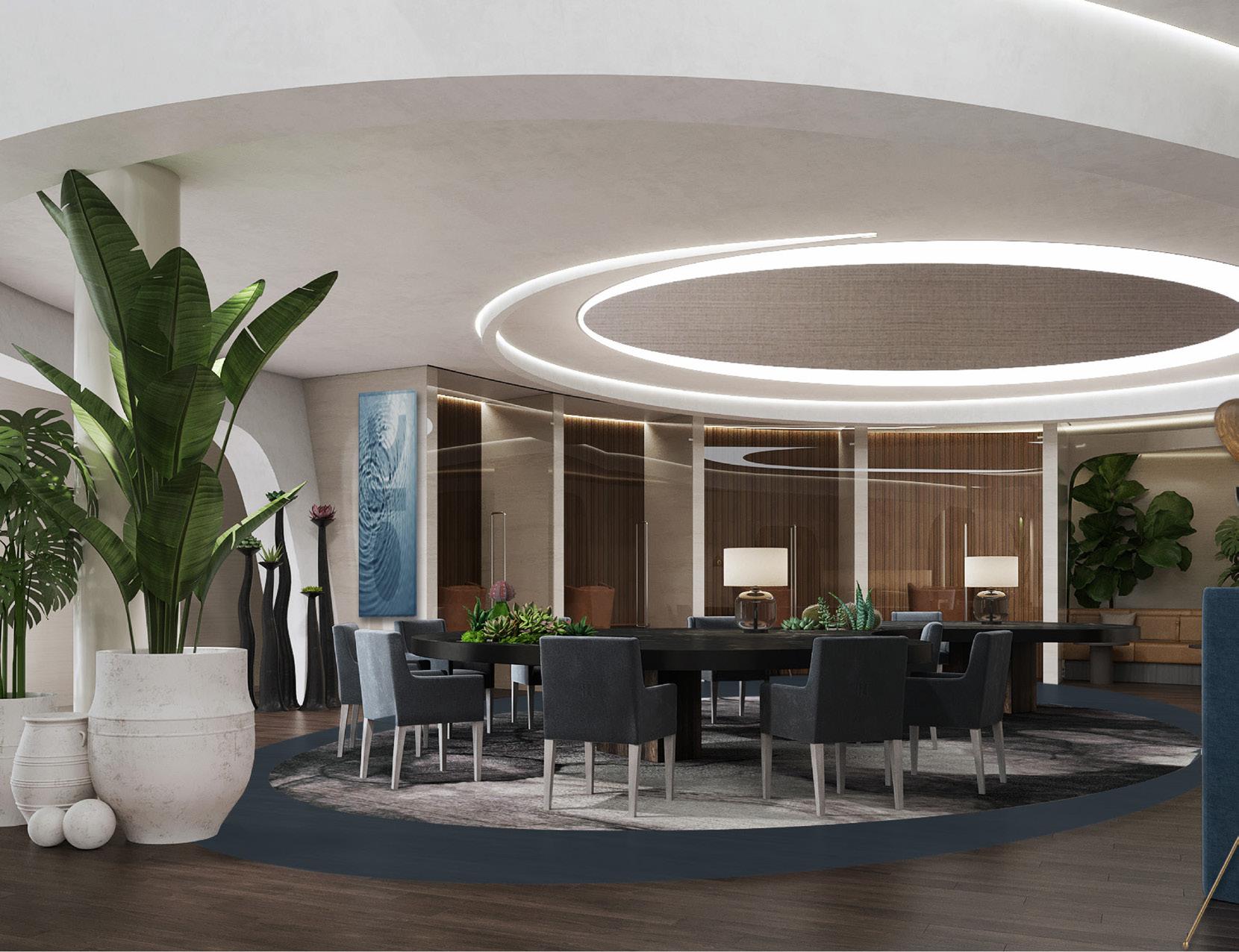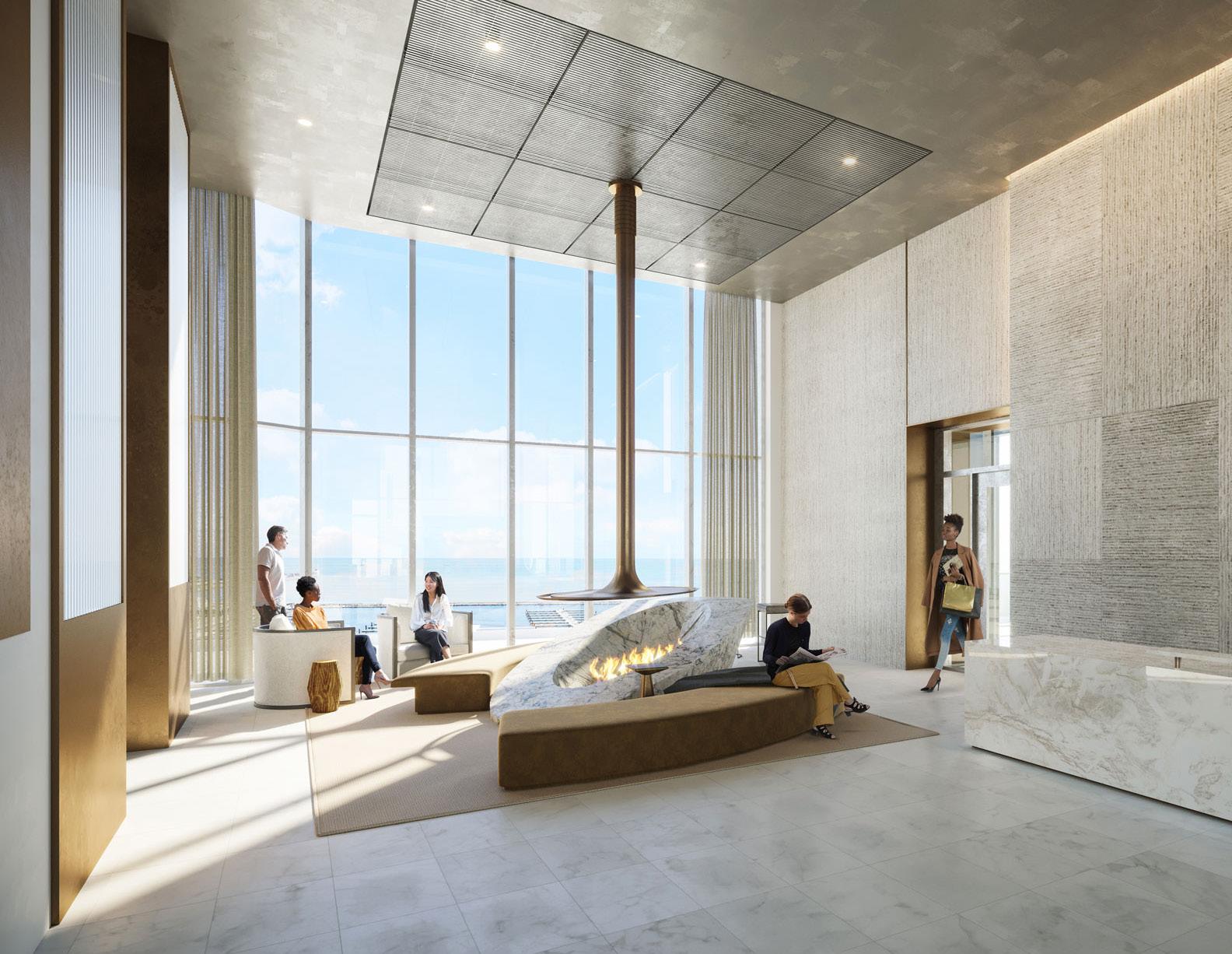Located at the last parcel of land at the intersection of the Chicago River and Lake Michigan, the Cirrus Luxury Condominiums embrace the luxury of unobstructed water views of the river and the lake. Spotlighting the voluminous, 18 ft. entryway and floor-to-ceiling transparent glass curtain wall systems, the lobby was designed to celebrate reflections of the water. As guests enter the lobby, they are drawn to the eye-catching, oval fireplace, which serves as a distinct design feature as well as a hub for socializing, working, relaxing and absorbing the beautiful lake views.