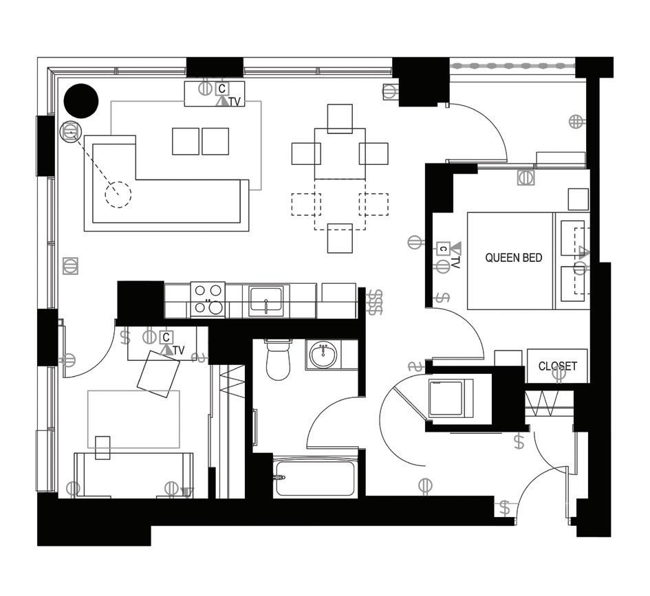 Our methods range from quick-hand sketches of space optimization studies that enable clients to visualize how they can maximize ROI on a unit, to architectural unit drawing studies that incorporate the structure, mechanical, electrical, plumbing, low voltage and other architectural components into the interior unit layouts. We also compose detailed furniture layouts to showcase how the unit can function in the most efficient way. The intention here is to help potential guests realize the true potential of these living units.