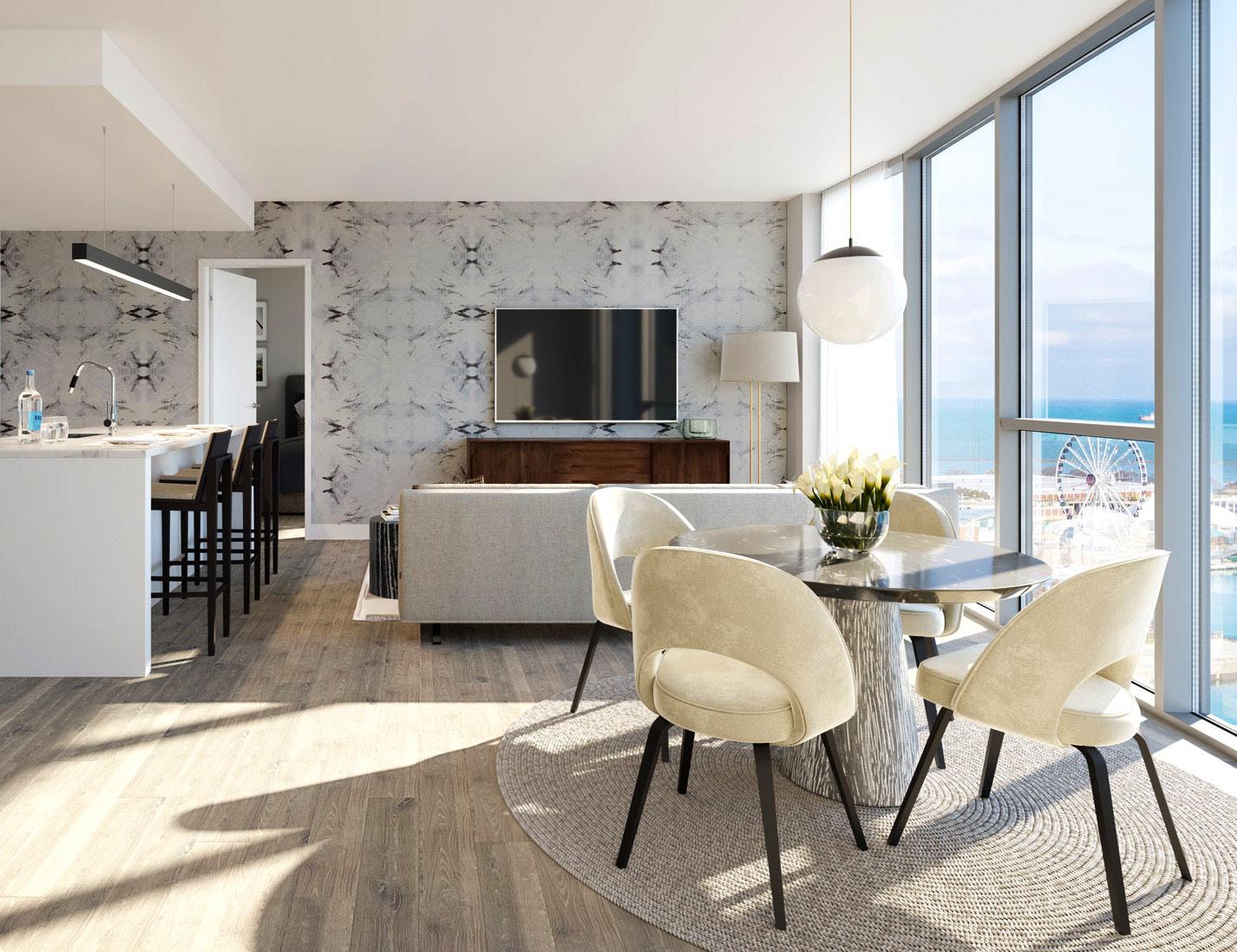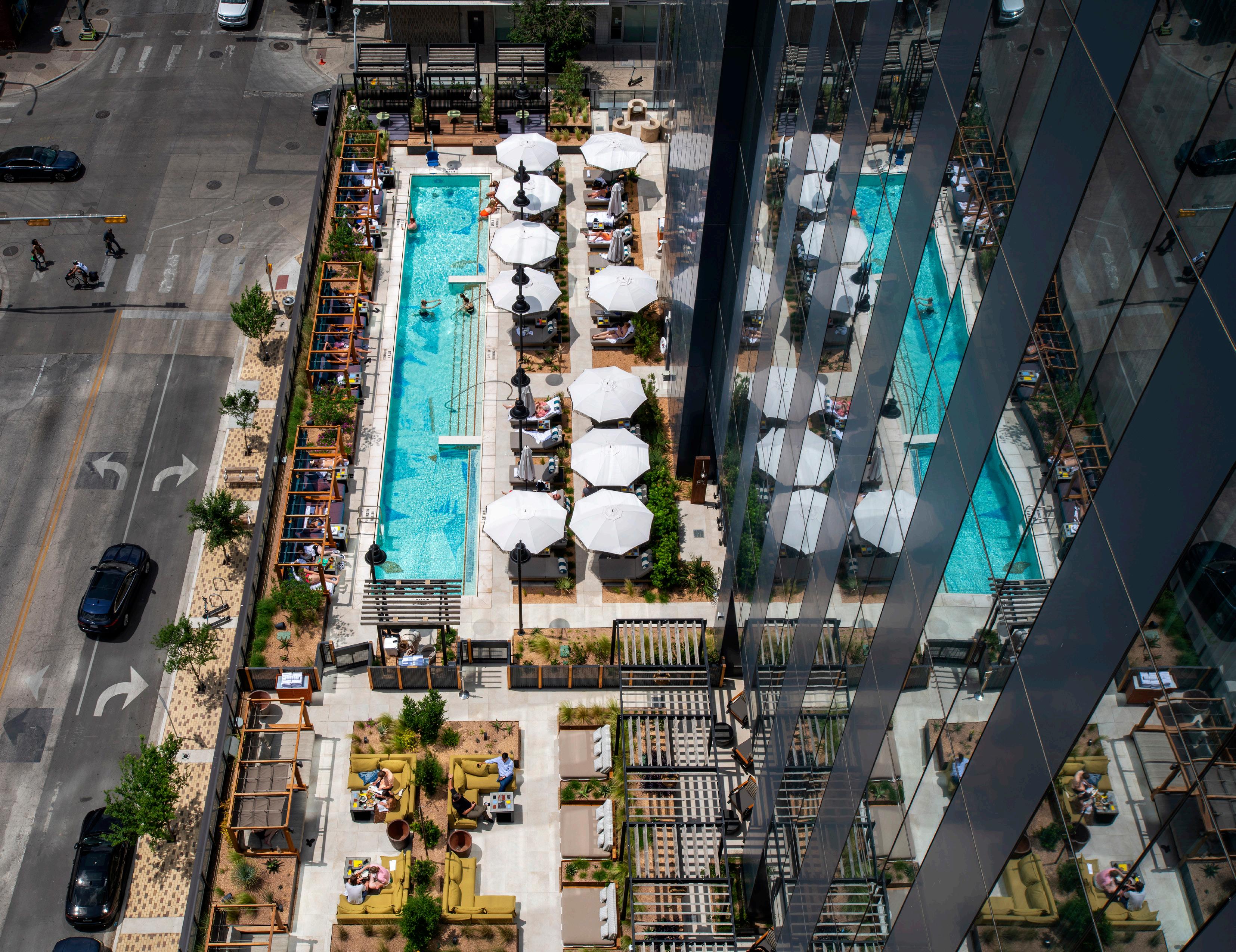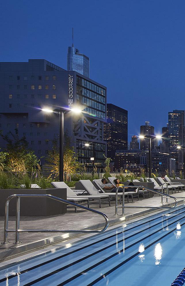 Spectacular views continue on the rooftop, which features an upscale Sky Lounge that provides flawless service and comfort as well as a large deck and double-height Fitness Center to fulfill all relax and recoup resident needs.