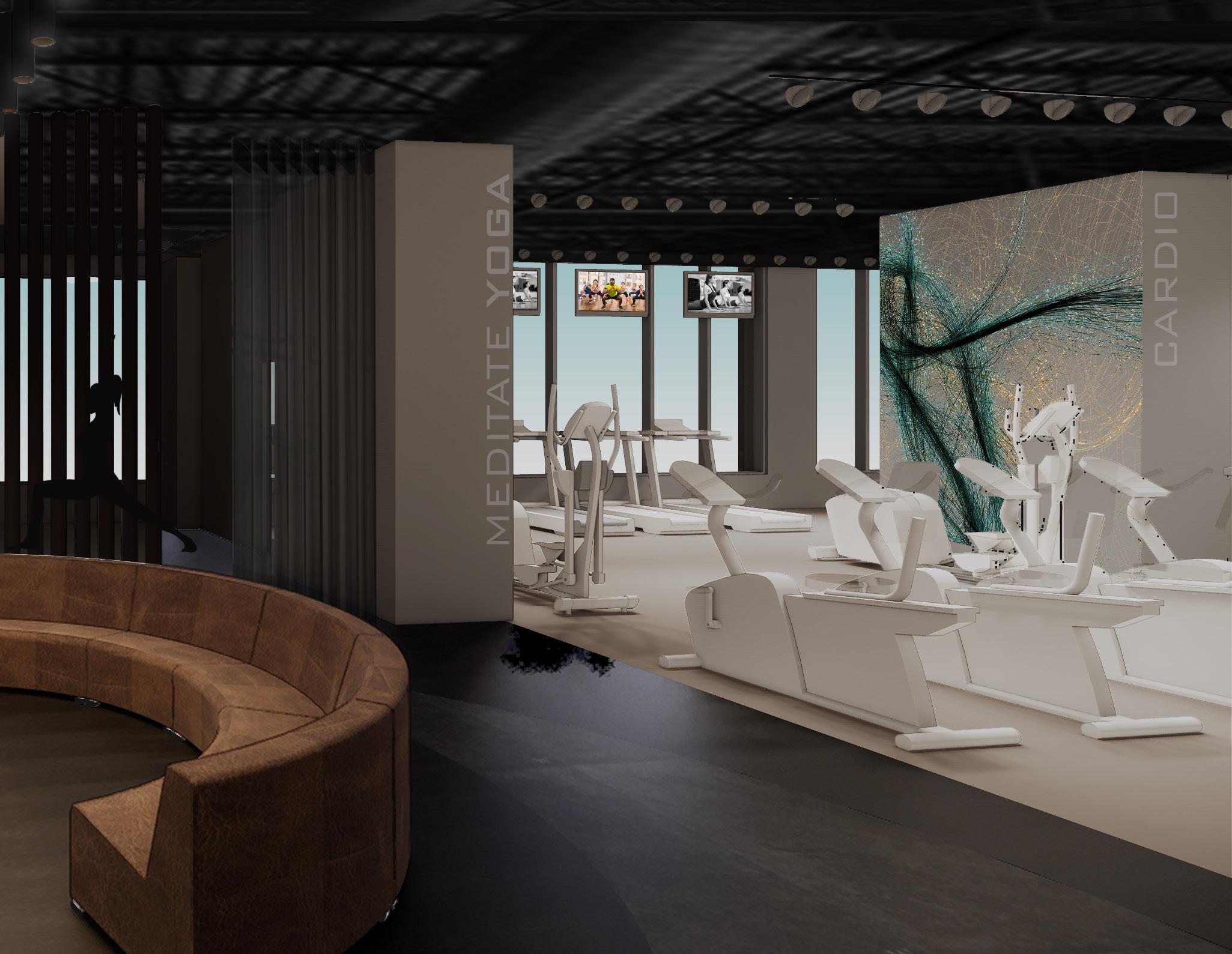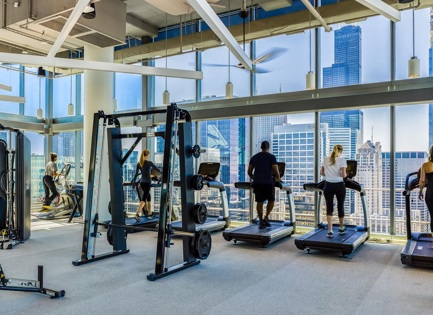 Featured above are images of fitness centers strategically located on the top floor of the building to serve as prime real estate and attract a fitness savvy community. Users enjoy the cityscape views and filtered natural light while working out.