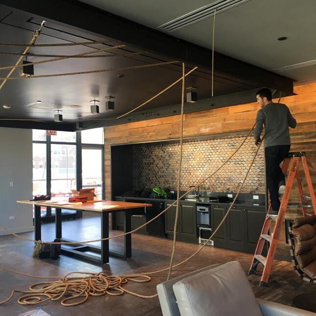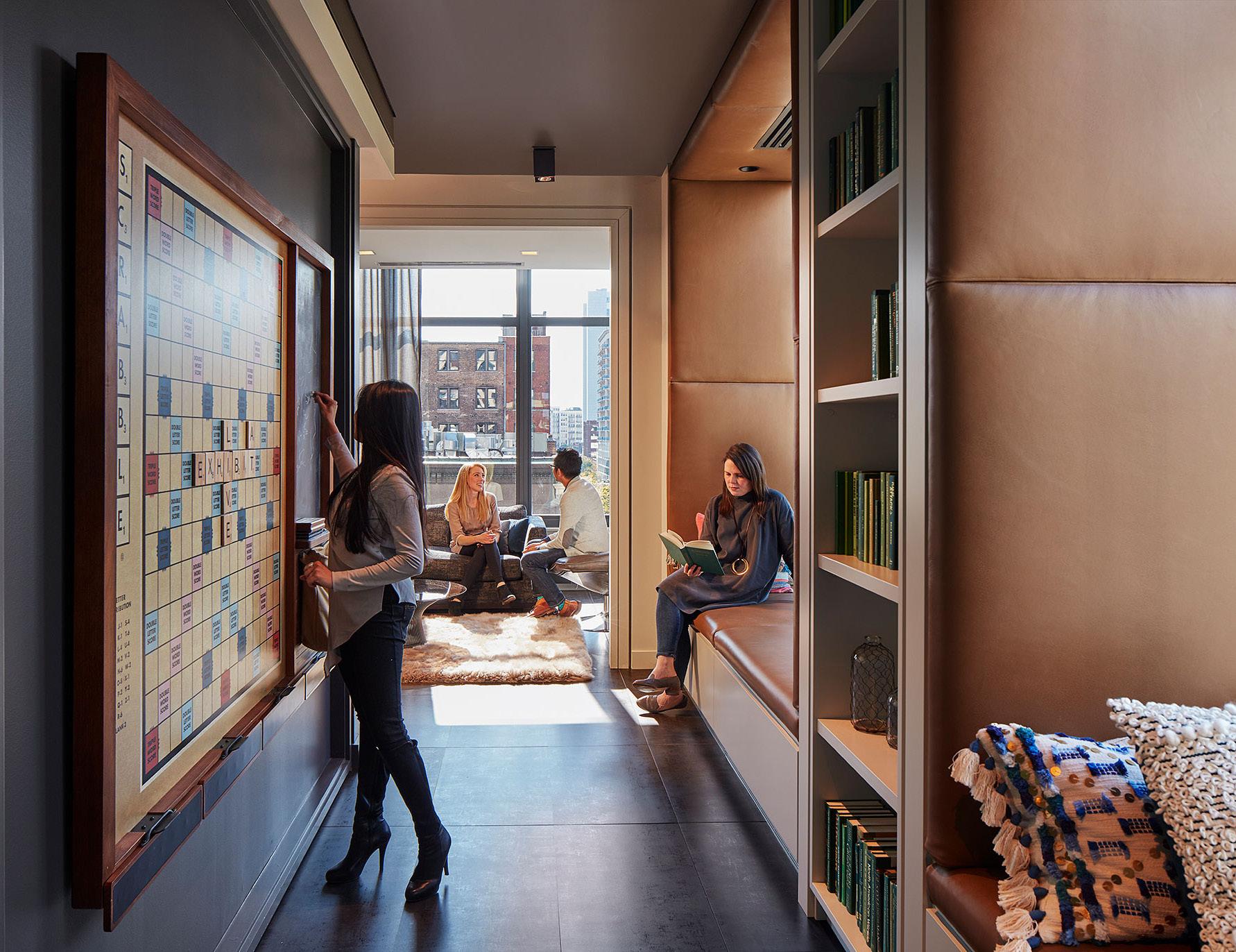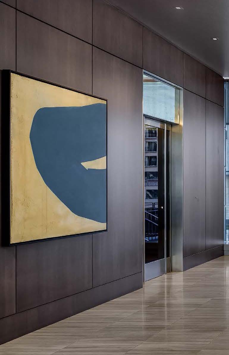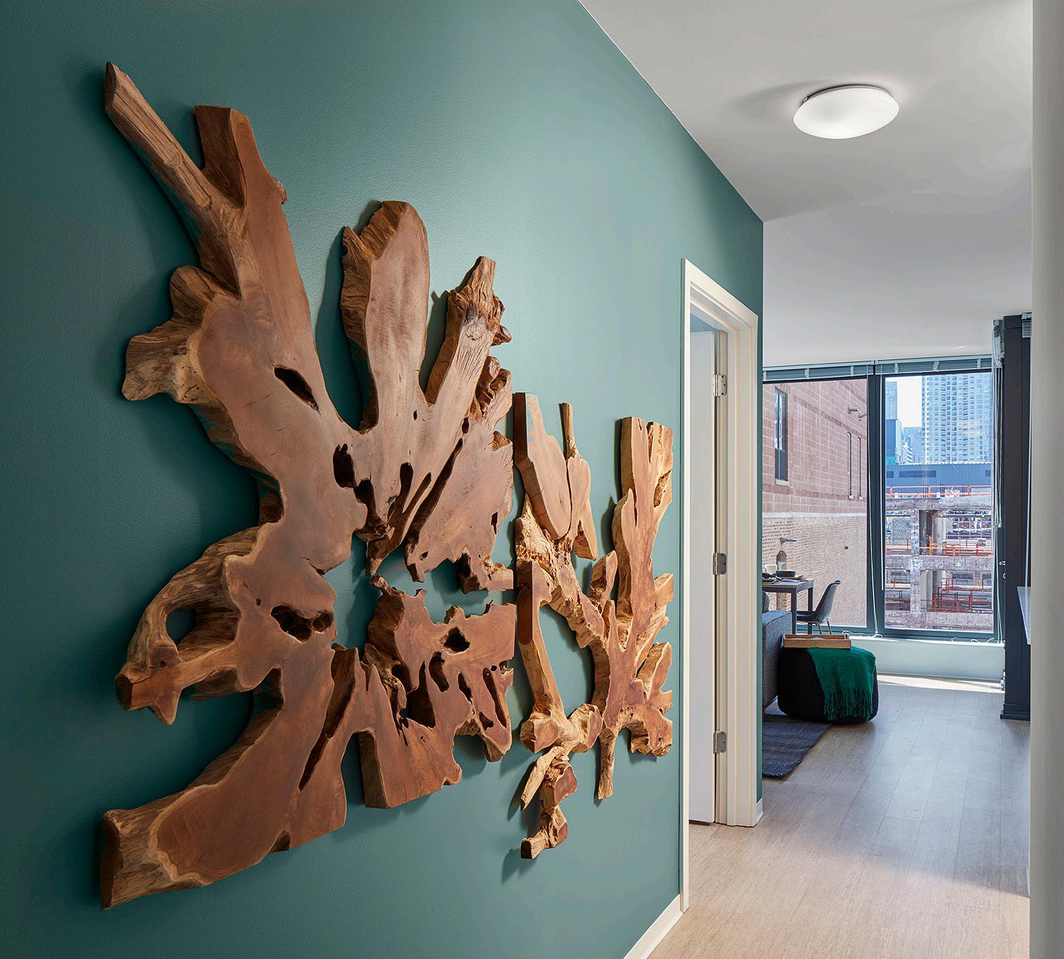 Dedicated to harnessing one’s artistic savvy, The Gallery on Wells is a residential tower located in Chicago’s River North neighborhood that lives true to its name. Tenants senses are immediately activated as they enter the dark and textured lobby, full of rich layering. An element of surprise is introduced as one moves through the entry, as a featured wall of black concrete blocks and stained wood slats unveil a bright elevator foyer. Mimicking a true gallery, references to pop art are seen throughout the building, while furnishings offer a contemporary and bright contrast.