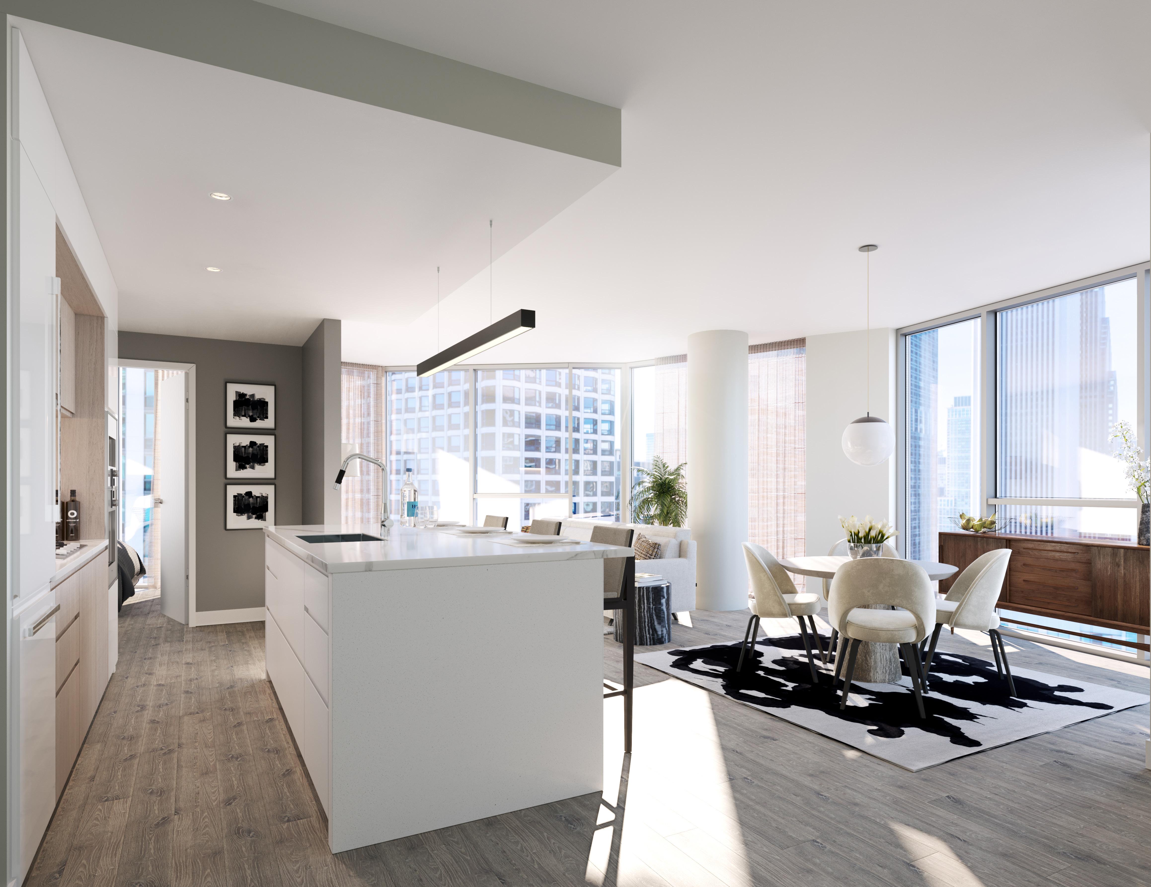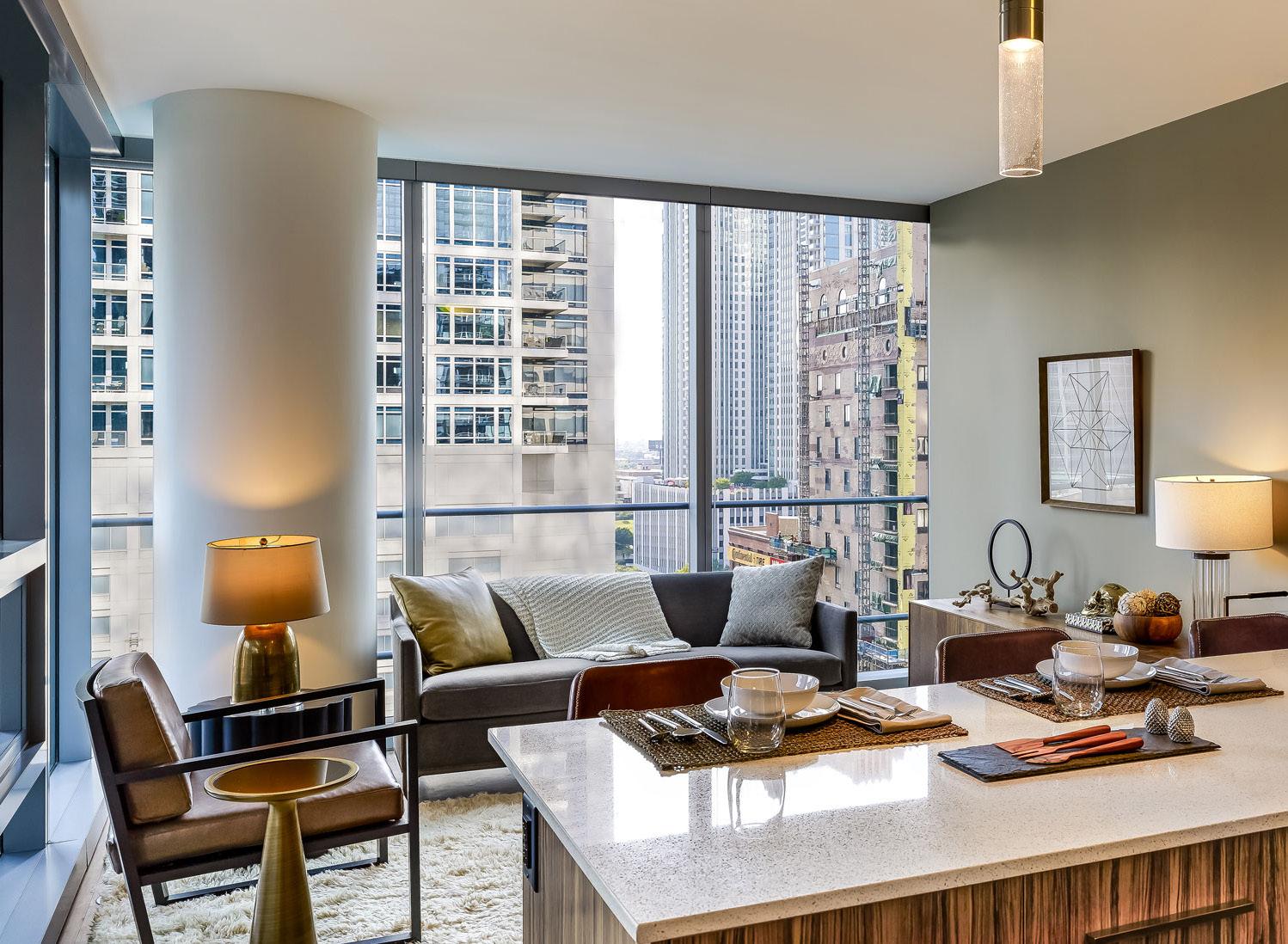Standing at 500 ft. tall, Wolf Point West is a residential high-rise that extends 48 stories from the converging banks of the north, south and east branches of the Chicago River. From this vantage point, residents enjoy unparalleled views of the city, river and lakefront.