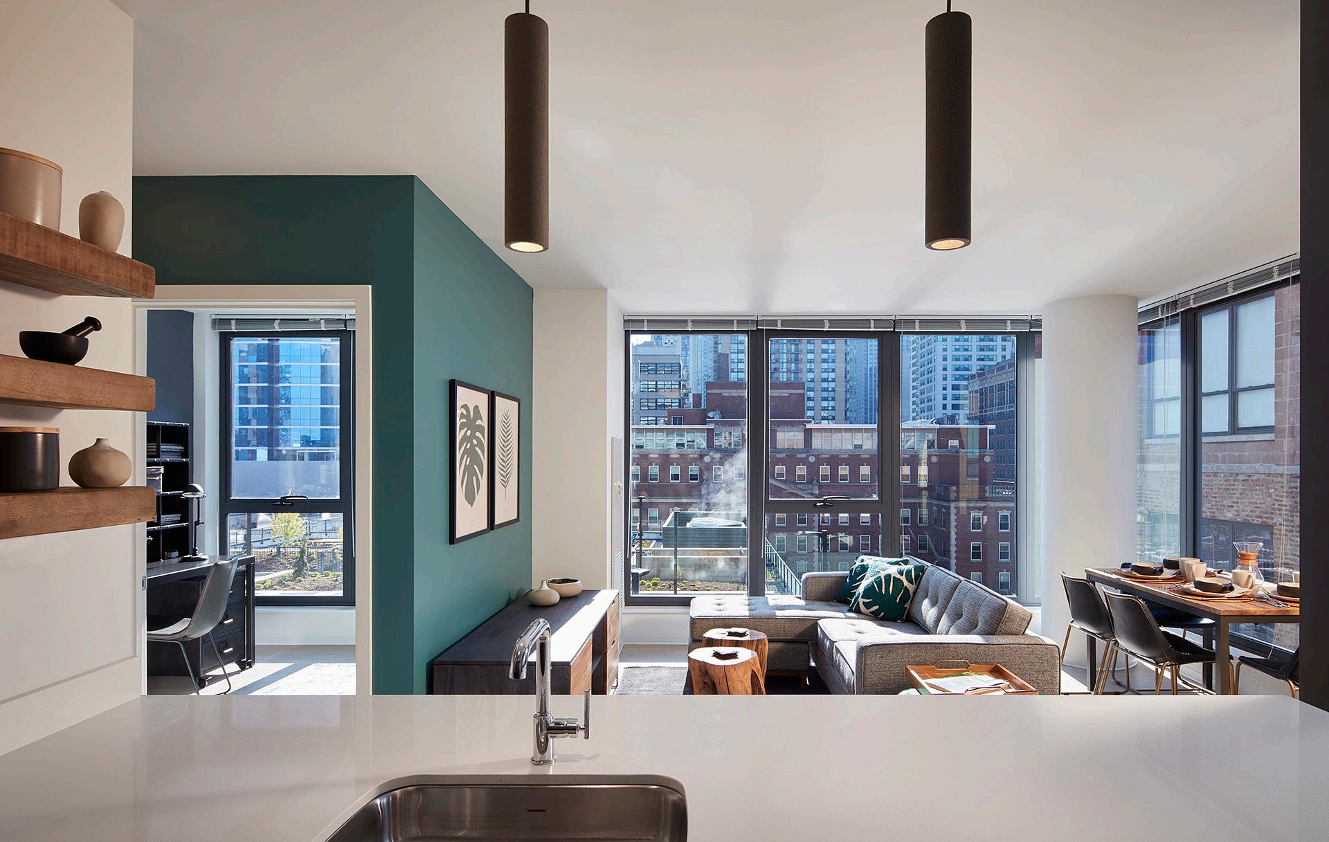 Exhibit is an eco-friendly, residential high-rise built in River North on the old historic site of Howard Johnson “HoJo” from the 1960s. The modern site includes 34-stories of sleek convertible units, a 5-story podium, retail space as well as a public park to create a respite from the bustling neighborhood. The artistic lobby and adjacent retail area create an open dialogue between the building’s interior and exterior space.