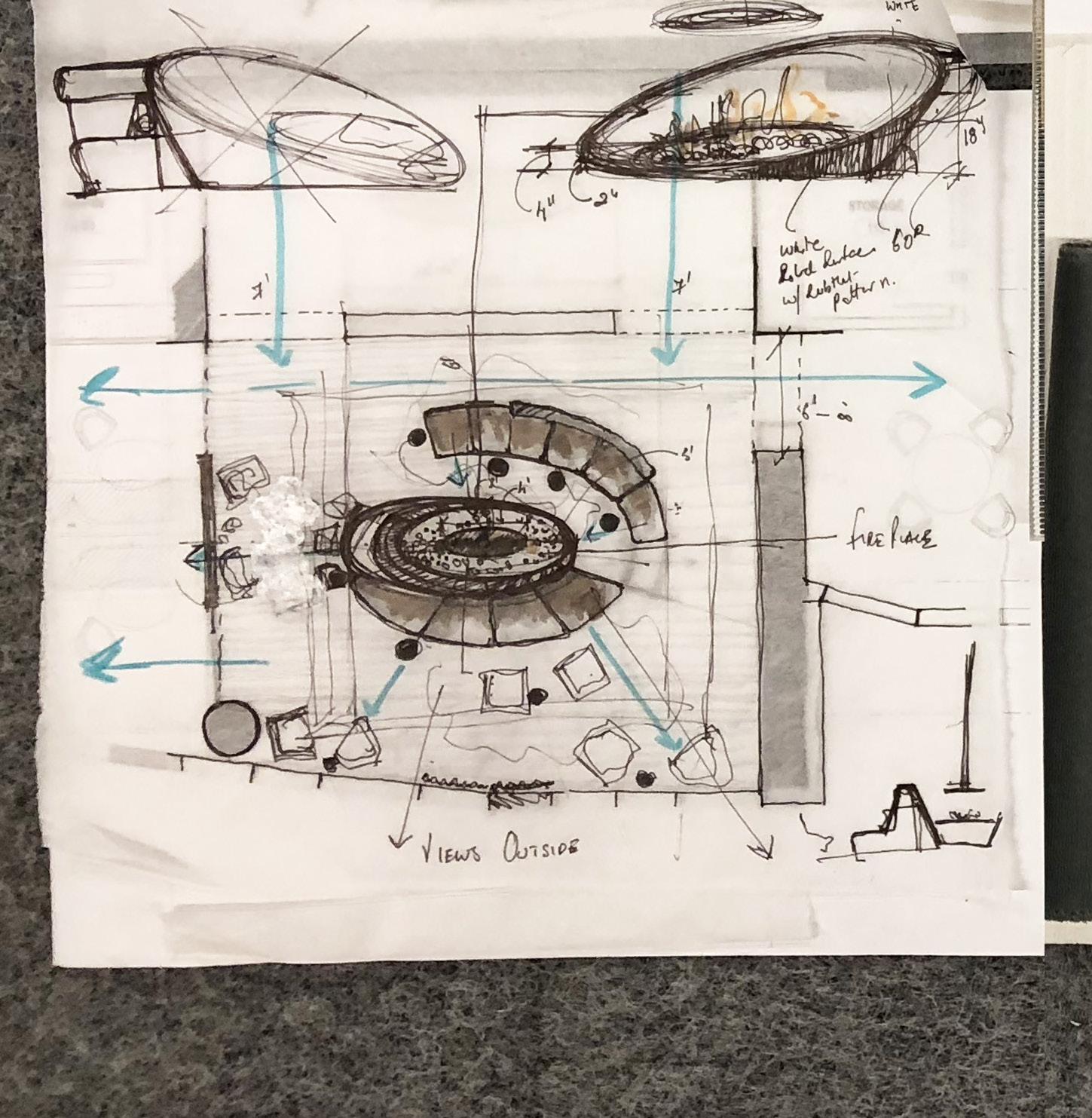This custom sculptural fire place was designed to host various functions - waiting area, lounge space to celebrate the Lake Michigan views, perching area for laptop users, and above all a community space for the residents and their guests.