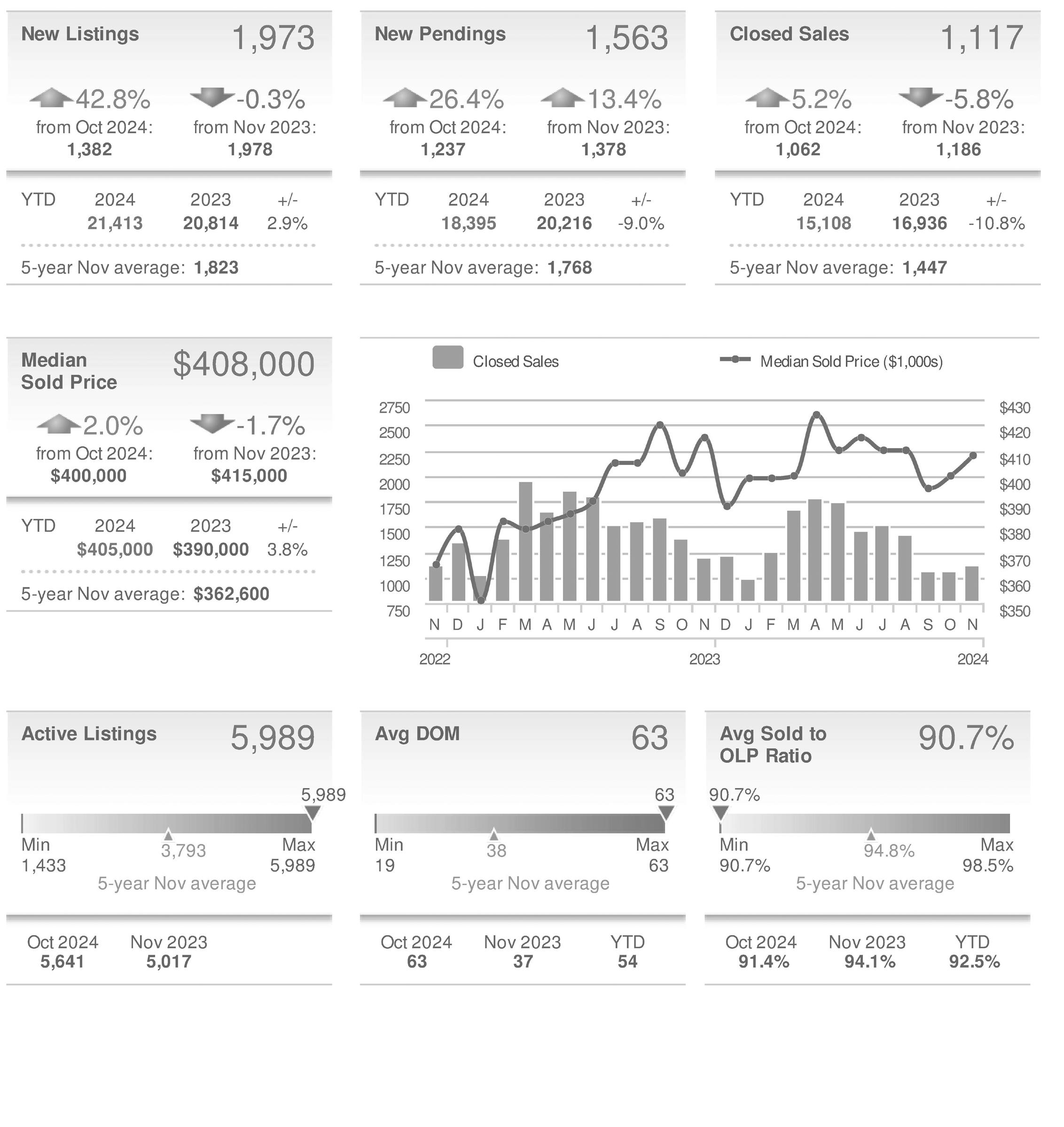 New listings surged 43% month-over-month, though still below last year’s figures for the same period. Pending and closed sales, as well as median sold prices, all showed gains from the previous month.