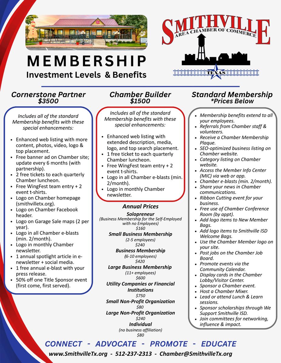 Being a member of the Smithville Area Chamber of Commerce means more than just joining an organization?it means being part of a thriving community Your membership connects you to valuable networking opportunities, increases your visibility, amplifies your voice, and provides resources for learning and growth We are deeply grateful to our current members for their ongoing support and engagement - you are the heart of our Chamber! If you've been considering joining, now is the perfect time to invest in your business and our community Let’s grow, connect, and succeed together! Visit https://business smithvilletx org/member/newmemberapp