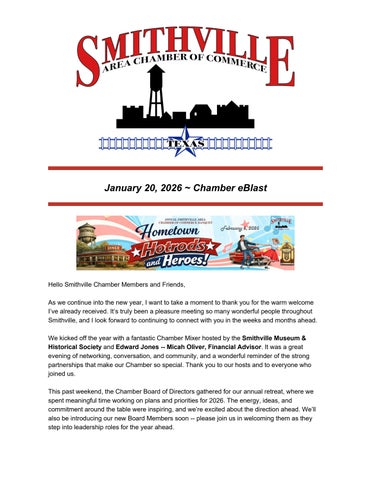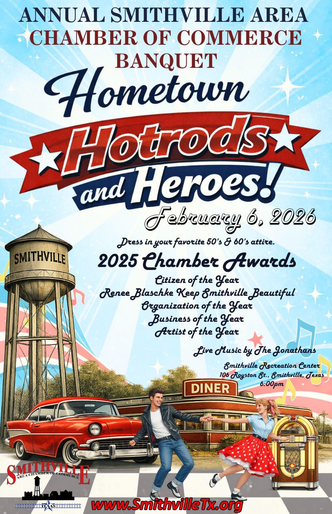 Mark your calendars for one of our most anticipated events of the year -- the 2026 Chamber Banquet and Awards on Friday, Febrauary 6, 2026! We are especially excited about this year’s theme, Hometown Hotrods & Heroes, and can’t wait to celebrate with you at what promises to be a fun, memorable evening honoring the people who help keep Smithville moving forward.