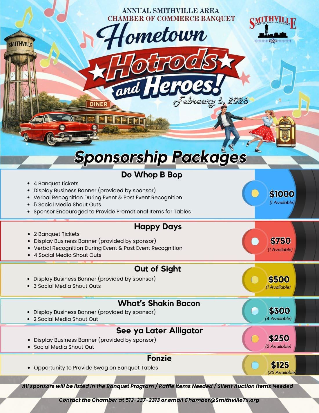 To secure your sponsorship, please contact the Smithville Area Chamber of Commerce at 512237-2313 or Chamber@SmithvilleTx.org