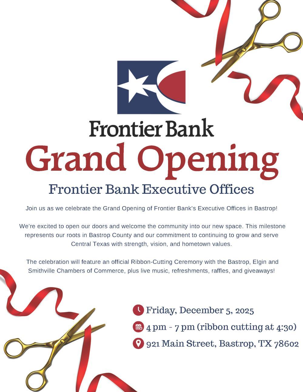 refreshments, and live music by Jason Molin. Then, on Friday, December 5, we hope you’ll join us in Bastrop as we celebrate Frontier Bank’s Triple Ribbon Cutting with the Bastrop, Elgin, and Smithville Chambers. This free event runs from 4-7 PM at 921 Main Street, with refreshments, music, a giveaway, and the ribbon cutting at 4:30 PM as Frontier opens its new executive offices.