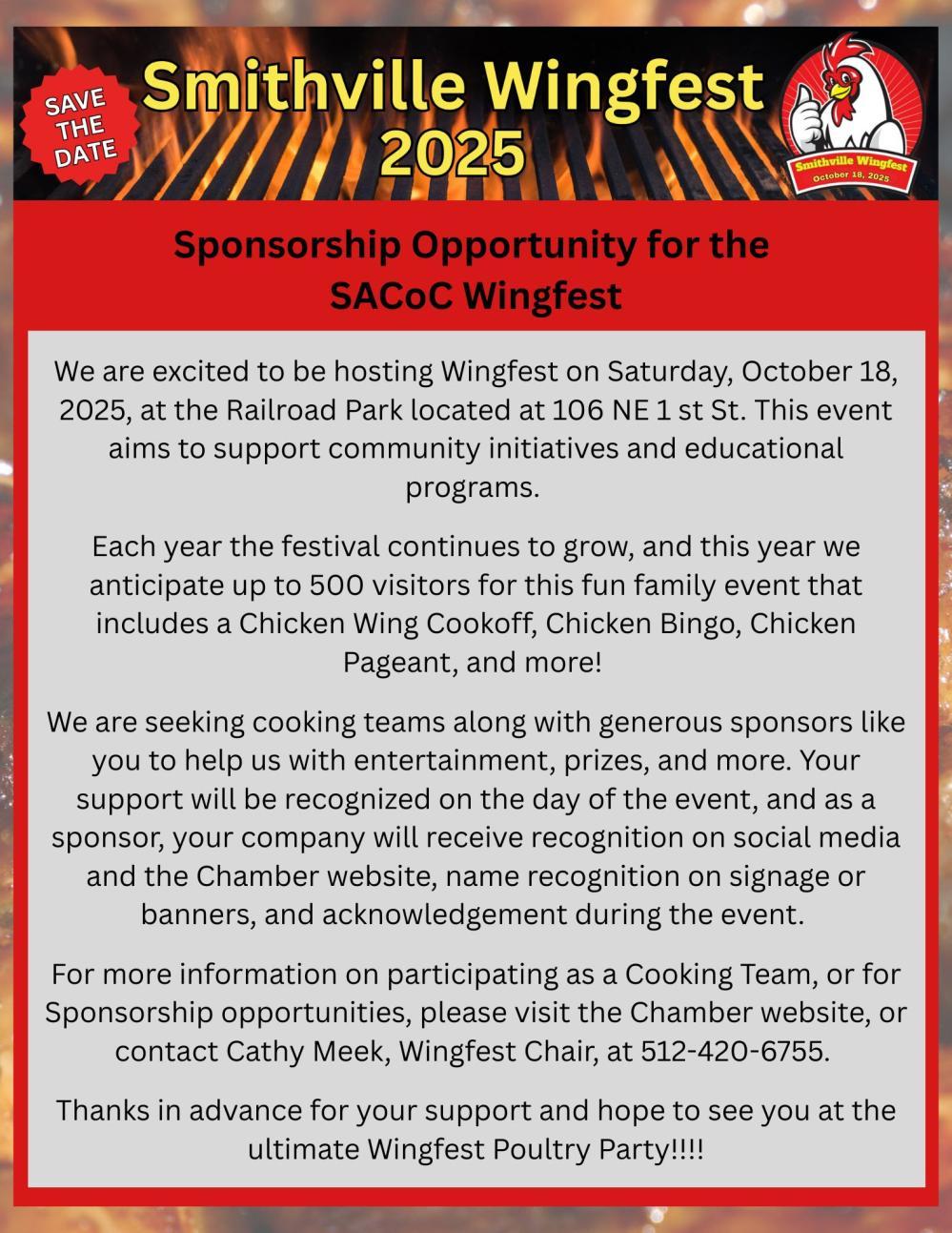 Now’s the time to register your team for the 7th Annual Smithville Wingfest, happening Saturday, October 18th! If you’re looking for great exposure, consider becoming a sponsor this is one of our biggest and most popular events of the year.