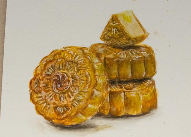 I couldn’t bake if my life depended on it, but I can paint. With my limited knowledge on mooncakes, I need ed to do my research and scrolled through countless images of them. The first time seeing them was like gazing upon an artist’s heaven with all the variation of styles and intri cate patterns embellished on the mooncakes. As my research came to an end, it was time to pick out my favorite mooncakes and get to work. Not to brag, but detailed work is my profession and expertise. With years of experience, I am con fident I can create anything with a few paint brushes and a couple hours of work.