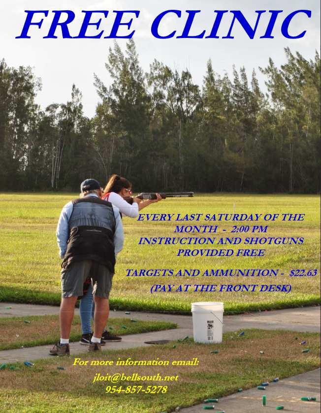 The Free Clinic has returned and will be every 4th Saturday of the month. Price is $22.63 for a practice round ticket and a box of shells. Price is reduced if you bring your own shells.