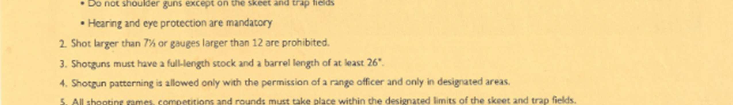 Shoots usually held the first Saturday of every month. Gauges may be shot out of sequence with the permission of management. More than one 50 target program may be shot in the same gauge as a preliminary event.