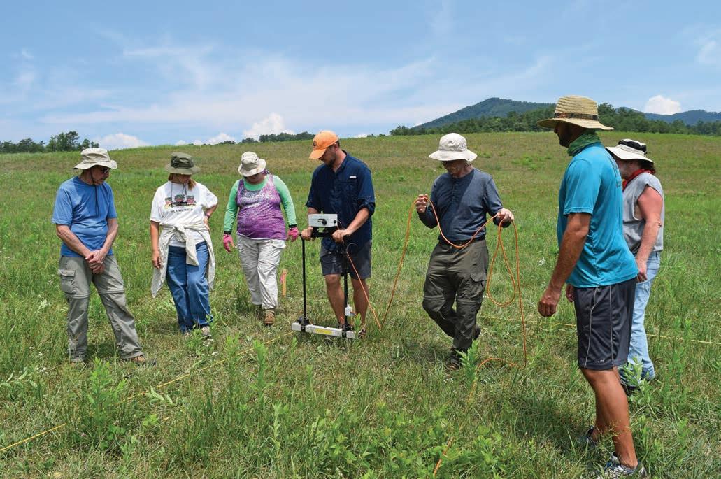 Cowee Mound in Macon County, as well as other native mounds around the region, represents an important part of Cherokee heritage and history. Archeologists spent the last two weeks at the mound site searching for artifacts using non-invasive tools to help protect the landscape. Their research will hopefully help them better understand the workings of the village that once surrounded the mound. (Page 6) National Park Service archeologist Michael Seibert (right) shows a group of volunteers how to use a piece of equipment to detect underground artifacts near Cowee Mound in Macon County. Jessi Stone photo