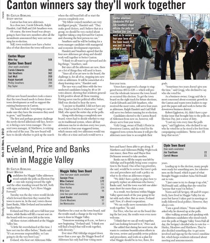 Matthews for a seat on the town board, said the results mark a change in the way business is done in Maggie Valley. “Tomorrow morning at 8 a.m., we have a new beginning,” Eveland said. “I think you will find a board that will work together, with diversity.” Ever since Phil Aldridge stepped down more than a year ago, the Maggie Board of Aldermen has only had four voting mem-