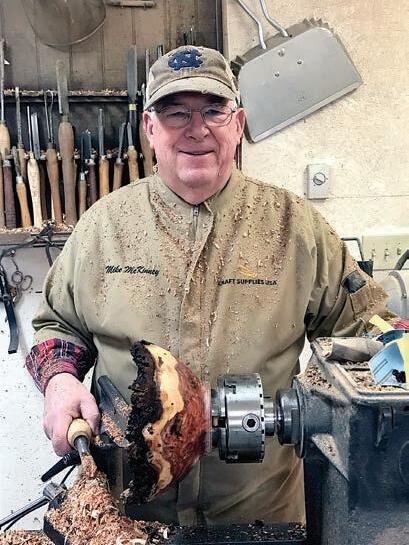 safe finishes. Some of Mike’s works are textured, carved, or embellished in a variety of ways. He especially enjoys creating items with special meaning for customers, whether it’s a bowl turned with wood from a childhood home or a gift turned out of hand-selected wood. Visitors to Mike McKinney’s studio can see his workspace and work process from drying burl wood to turning and finishing. Mike is happy to give demonstrations, and the process is a sight to see. Turning wood on the lathe can throw shavings across a room. Mike enjoys hosting visitors to his shop and sharing the finer details of his craft. His showroom features many of his finished pieces on display and available for purchase.