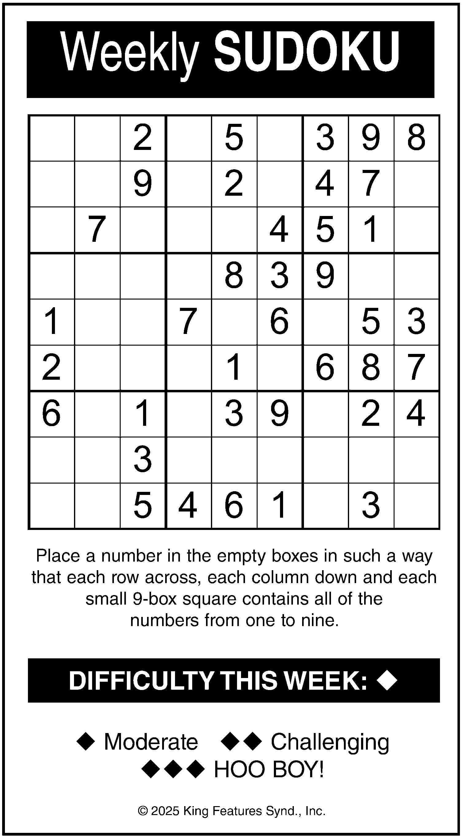 Here’s How It Works: Sudoku puzzles are formatted as a 9x9 grid, broken down into nine 3x3 boxes. To solve a sudoku, the numbers 1 through 9 must fill each row, column and box. Each number can appear only once in each row, column and box. You can figure out the order in which the numbers will appear by using the numeric clues already provided in the boxes. The more numbers you name, the easier it gets to solve the puzzle!