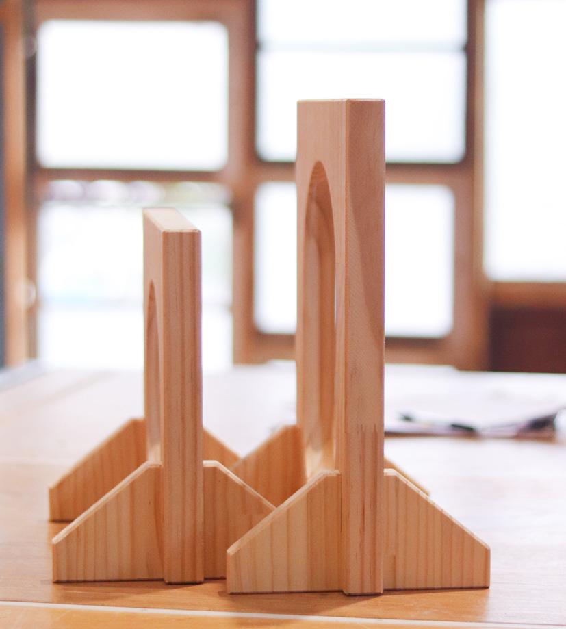我們製作了兩個高低不同的木 製台,台腳以卡榫方式,讓人 可以拆、裝,中間則留設可以 讓鋼珠運行的溝巢,深度必須 剛好以免鋼珠卡住或掉落,加 上修邊、倒角,則使整體觸覺 更加溫潤。
