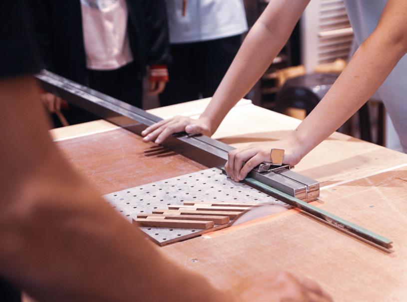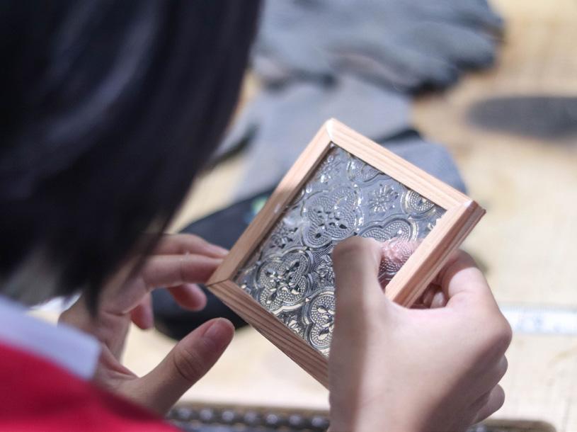 2022 年,我們設計了「檜木老窗花 杯墊」課程,內容不僅有切割玻璃, 也有操作鉅台裁切木條的製程。而來 訪的孩子們,總會表現出令人出乎意 料的樣貌。從一開始害怕鉅台的巨大 聲響,到課程最後游刃有餘地說要再 做一個給家人、老師。實際上,孩子 們總比大人想像地還要有更多可能。