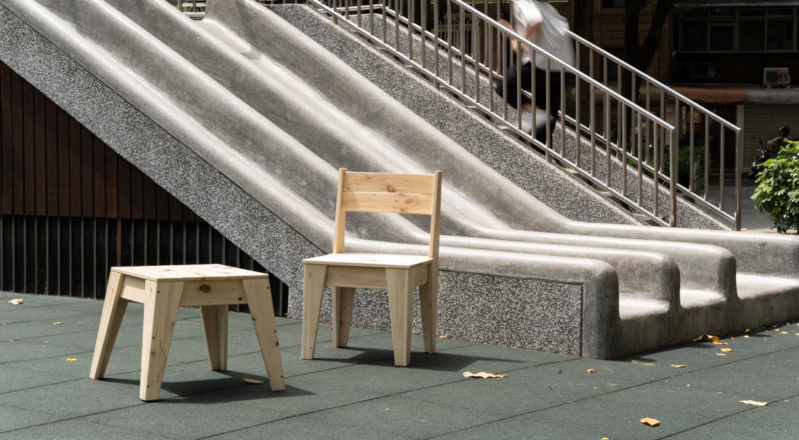 木棧板是便宜且承重性高的建材,但使用它 作為施工材料時,需要挑出較沒有使用痕跡 的材料,進行打磨整理,才能再製為可使用 的傢具,加上考量此傢俱有展示於公園的需 求,我們要需要特別做防水處理。