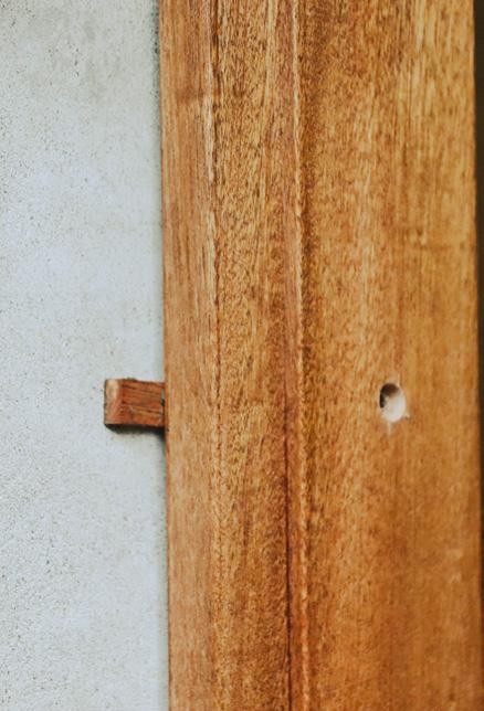 在木作部分,我們完成了新州 屋的門窗修復,沿用老門窗的 台灣檜木,保留銅器門把,並 搭配香杉、柳杉、櫸木作為門 窗框,讓新舊材料和諧並陳。