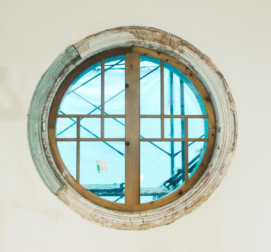 其中二樓相當具有代表性的圓 窗,也是具有挑戰性的工程, 過程中木工師需要不斷拼接、 打樣、圓邊銜接,並僅靠著老 照片作回原本的樣式。且刻意 留下窗框泥塑與石灰的斷差, 呈現出修復的過程。
