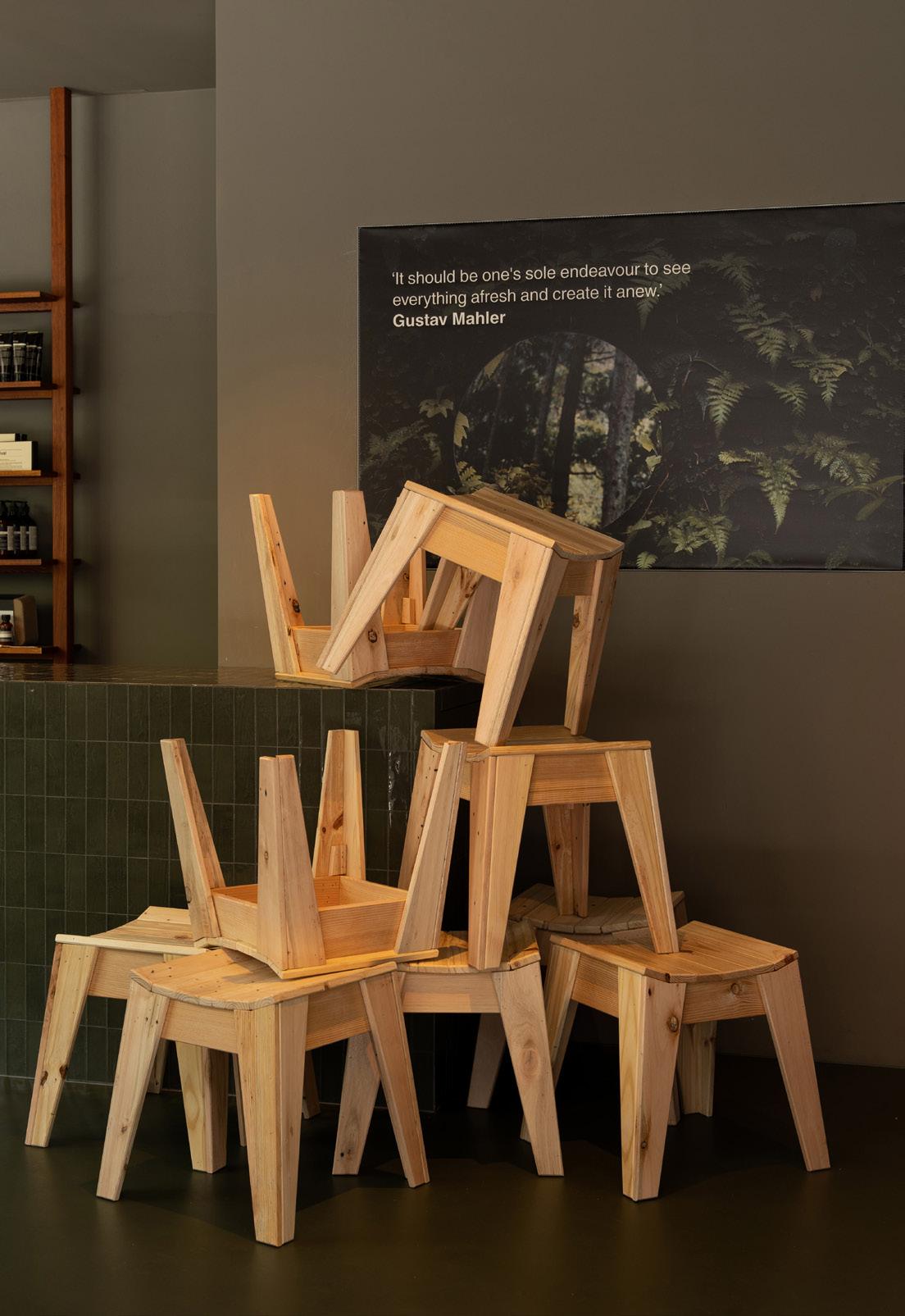 討論過程中,我們設 計了多款傢俱,強調 「質樸」和「簡約」, 一方面回應 Aēsop 的 理念,一方面也希望 讓使用者感到自在。
