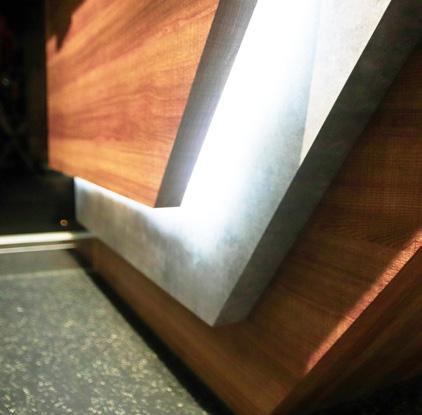 櫃台是進入空間之後 的第一站,我們設計 層次交疊的水泥與木 質,再搭配低調的間 接燈光和表現動感的 斜向造型,溫馨之餘 多了一點現代感。