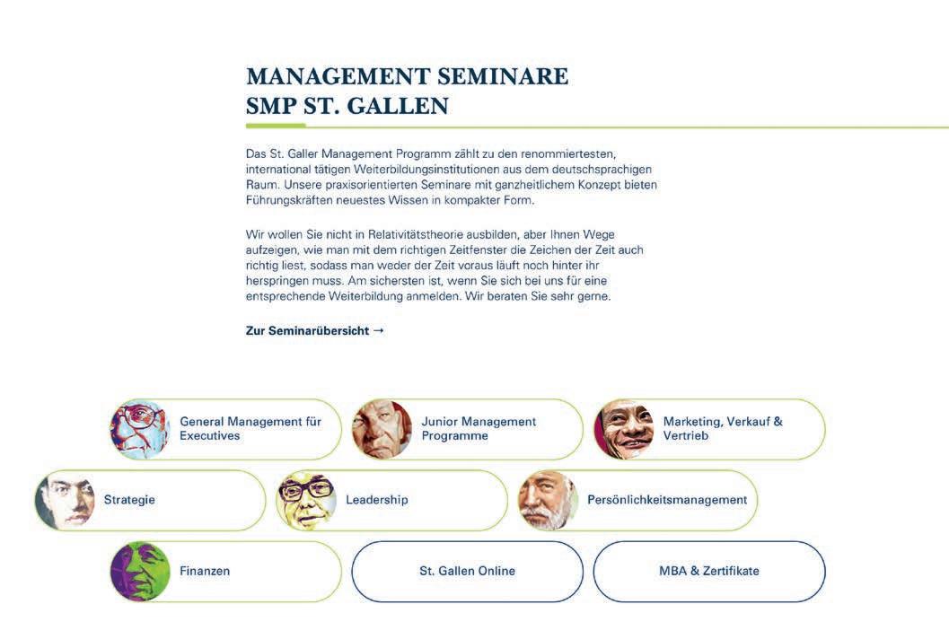 Das St. Galler Management Programm gehört seit vielen Jahren zu den führenden und renommiertesten Weiterbildungsinstitutionen Europas. Unsere hochkarätigen Referenten, Professoren und Berater vermitteln aktuelles Management-Wissen zu sämtlichen Aspekten der modernen Unternehmensführung