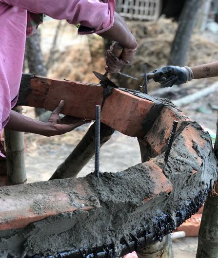 Preparation of the mould for the steps made from concrete and brick Setting of bricks around the circular periphery to conctruct the brick dome After the completion Ecosan structure, roof and wall panels were added
