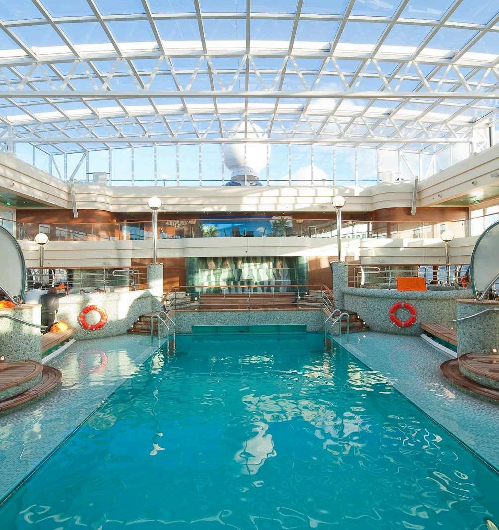 Le navire offre un Spa Aurea avec vue sur la mer, un solarium privé, et des piscines spacieuses, dont une avec toit rétractable pour une baignade en toute saison.