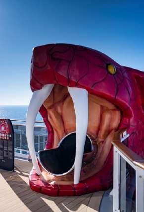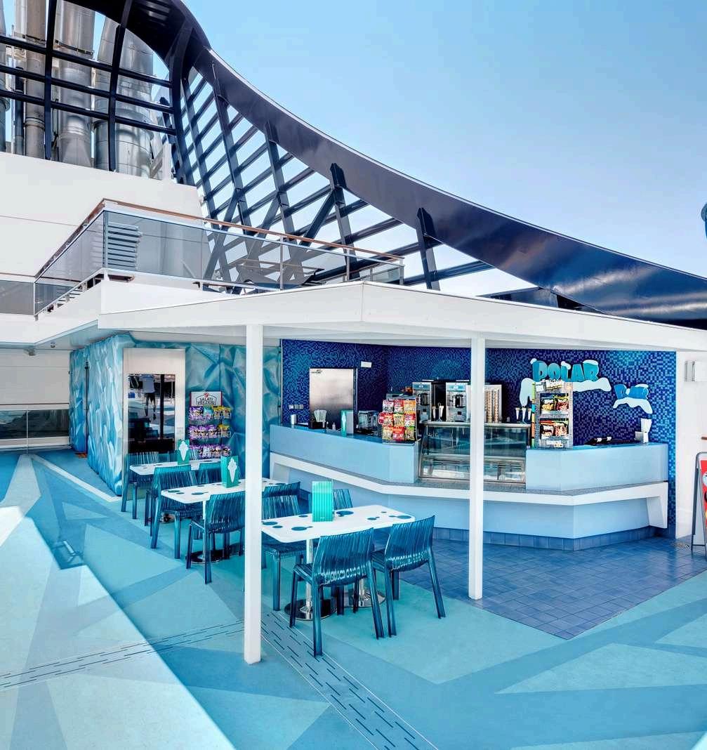 Il a un design futuriste, avec une silhouette élancée, une proue verticale, un arrière en forme de Y, et le plus long toboggan en mer. Il dispose également d’un dôme LED cinétique dans la galerie intérieure