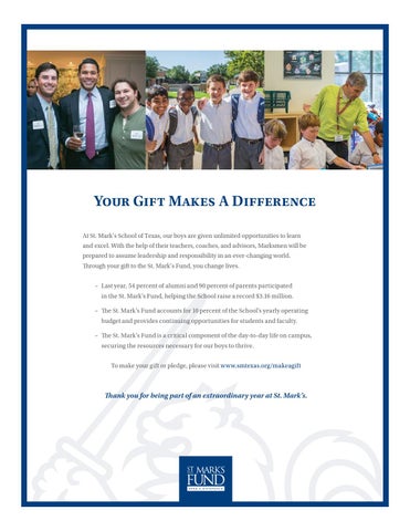 Your Gift Makes A Difference At St. Mark’s School of Texas, our boys are given unlimited opportunities to learn and excel. With the help of their teachers, coaches, and advisors, Marksmen will be prepared to assume leadership and responsibility in an ever-changing world. Through your gift to the St. Mark’s Fund, you change lives.