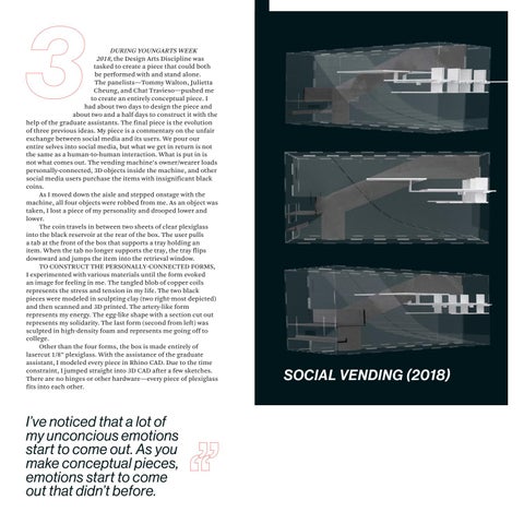 DURING YOUNGARTS WEEK 2018, the Design Arts Discipline was tasked to create a piece that could both be performed with and stand alone. The panelists—Tommy Walton, Julietta Cheung, and Chat Travieso—pushed me to create an entirely conceptual piece. I had about two days to design the piece and about two and a half days to construct it with the help of the graduate assistants. The final piece is the evolution of three previous ideas. My piece is a commentary on the unfair exchange between social media and its users. We pour our entire selves into social media, but what we get in return is not the same as a human-to-human interaction. What is put in is not what comes out. The vending machine’s owner/wearer loads personally-connected, 3D objects inside the machine, and other social media users purchase the items with insignificant black coins. As I moved down the aisle and stepped onstage with the machine, all four objects were robbed from me. As an object was taken, I lost a piece of my personality and drooped lower and lower. The coin travels in between two sheets of clear plexiglass into the black reservoir at the rear of the box. The user pulls a tab at the front of the box that supports a tray holding an item. When the tab no longer supports the tray, the tray flips downward and jumps the item into the retrieval window. TO CONSTRUCT THE PERSONALLY-CONNECTED FORMS, I experimented with various materials until the form evoked an image for feeling in me. The tangled blob of copper coils represents the stress and tension in my life. The two black pieces were modeled in sculpting clay (two right-most depicted) and then scanned and 3D printed. The artery-like form represents my energy. The egg-like shape with a section cut out represents my solidarity. The last form (second from left) was sculpted in high-density foam and represents me going off to college. Other than the four forms, the box is made entirely of lasercut 1/8” plexiglass. With the assistance of the graduate assistant, I modeled every piece in Rhino CAD. Due to the time constraint, I jumped straight into 3D CAD after a few sketches. There are no hinges or other hardware—every piece of plexiglass fits into each other.