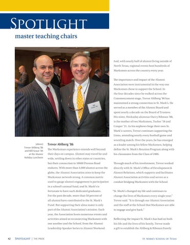And, with nearly half of alumni living outside of North Texas, regional events host hundreds of Marksmen across the country every year. The importance and impact of the Alumni Association were instrumental in the way one Marksman chose to support the School. In the four decades since he walked across the Commencement stage, Trevor Ahlberg ’86 has maintained a strong connection to St. Mark’s. He served as a member of the Alumni Board and spent nearly a decade on the Board of Trustees. His sister, Hockaday alumnae Darcy Ribman ’88, is the mother of two Marksmen, Tucker ’18 and Cooper ’21. As his nephews forge their own St. Mark’s careers, Trevor continues supporting the Lions, attending nearly every football game and wrestling match. Over the years, he has emerged (above) Trevor Ahlberg ’86 and Bill Graue ’84 at the Alumni Holiday Luncheon