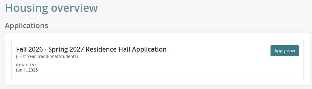 4. Select the housing application form Under “Housing overview, ” select “Apply now” for the Fall 2026 – Spring 2027 Residence Hall Application