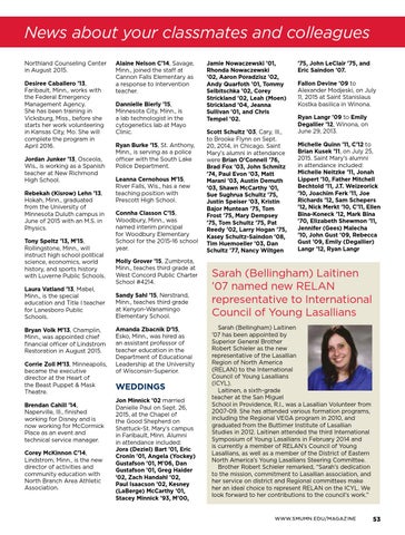 News about your classmates and colleagues Northland Counseling Center in August 2015. Desiree Caballero ’13, Faribault, Minn., works with the Federal Emergency Management Agency. She has been training in Vicksburg, Miss., before she starts her work volunteering in Kansas City, Mo. She will complete the program in April 2016. Jordan Junker ’13, Osceola, Wis., is working as a Spanish teacher at New Richmond High School. Rebekah (Kisrow) Lehn ’13, Hokah, Minn., graduated from the University of Minnesota Duluth campus in June of 2015 with an M.S. in Physics. Tony Speltz ’13, M’15, Rollingstone, Minn., will instruct high school political science, economics, world history, and sports history with Luverne Public Schools. Laura Vatland ’13, Mabel, Minn., is the special education and Title I teacher for Lanesboro Public Schools. Bryan Volk M’13, Champlin, Minn., was appointed chief financial officer of Lindstrom Restoration in August 2015. Corrie Zoll M’13, Minneapolis, became the executive director at the Heart of the Beast Puppet & Mask Theatre. Brendan Cahill ’14, Naperville, Ill., finished working for Disney and is now working for McCormick Place as an event and technical service manager. Corey McKinnon C’14, Lindstrom, Minn., is the new director of activities and community education with North Branch Area Athletic Association.