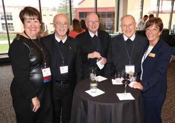 Ann Merchlewitz M’95, J.D.; Brother Robert Schieler, FSC, trustee; Brother Thomas Johnson, FSC, trustee; Brother Michael Fehrenbach, FSC, trustee; and Angela (Scully) Steger B’76, trustee, gather for the celebration.