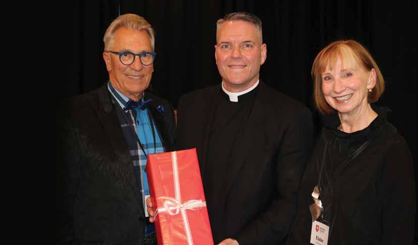 Roger B’67 and Elaine Haydock, campaign cochairs and inspiring Lasallian Catholic leaders, are honored by Father James P. Burns, IVD, Ph.D., president. Roger Haydock was also recognized during the ceremony for faithfully and passionately serving as a trustee for two terms, for his work on committees, and for his tireless support to the university and to Saint Mary’s students.