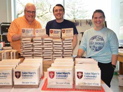 With the help of Matt Klosky, assistant professor, director of the Kabara Institute for Entrepreneurial Studies, and our resident woodworker, and Terra Lieser, makerspace coordinator — along with the hard work of Saint Mary’s students, 180 blocks of wood were carved, poured with resin, and sanded. They beautifully display Saint Mary’s logo and the words, “Because of you,” — words that express the university’s gratitude to everyone who has supported this campaign, and all those, including faculty and staff, who have dedicated their time and their energy to caring and nurturing our students. And, made by our own students’ hands, they take on a special meaning.
