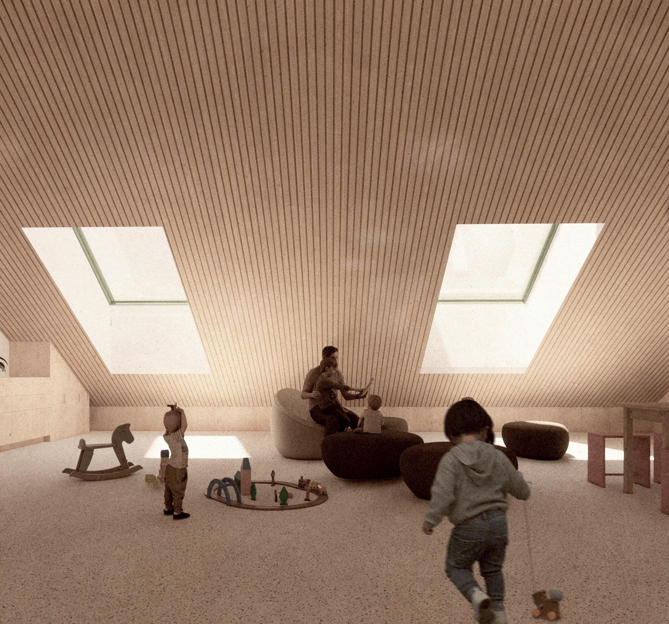 Holstinpuron puiston viereen asettuva rakennus rajaa suojaisan sylin etelään päin ja suojaa liikenteen melulta. Rakennuksella on selkeä ja johdonmukainen hahmo. Massoittelu perustuu kahteen harjakattoiseen rakennukseen jotka yhdistyvät läpihengittävällä kevyellä kappaleella. Rakennus näyttäytyy katutilaan selkeälinjaisen pelkistetyltä ja pienimittakaavaisena helposti lähestyttvänä päiväkotina. Päiväkoti ammentaa inspiraationsa perinteisistä harjakattoisista aitoista. Julkisivut esitetään toteutettavaksi kuusipanelointina. Isot ikkuna avaukset myös luovat pienimittakaavaisen tunnelman julkisivuihin. Rakennus on lämminhenkinen ja avoin. Väriltään vihreä puujulkisivu antaa päiväkodille tunnistettavan identiteetin metsäpäikkynä. Pihan julkisivua jäsentää julkisivuun upotetut katokselliset sisäänkäynnit.