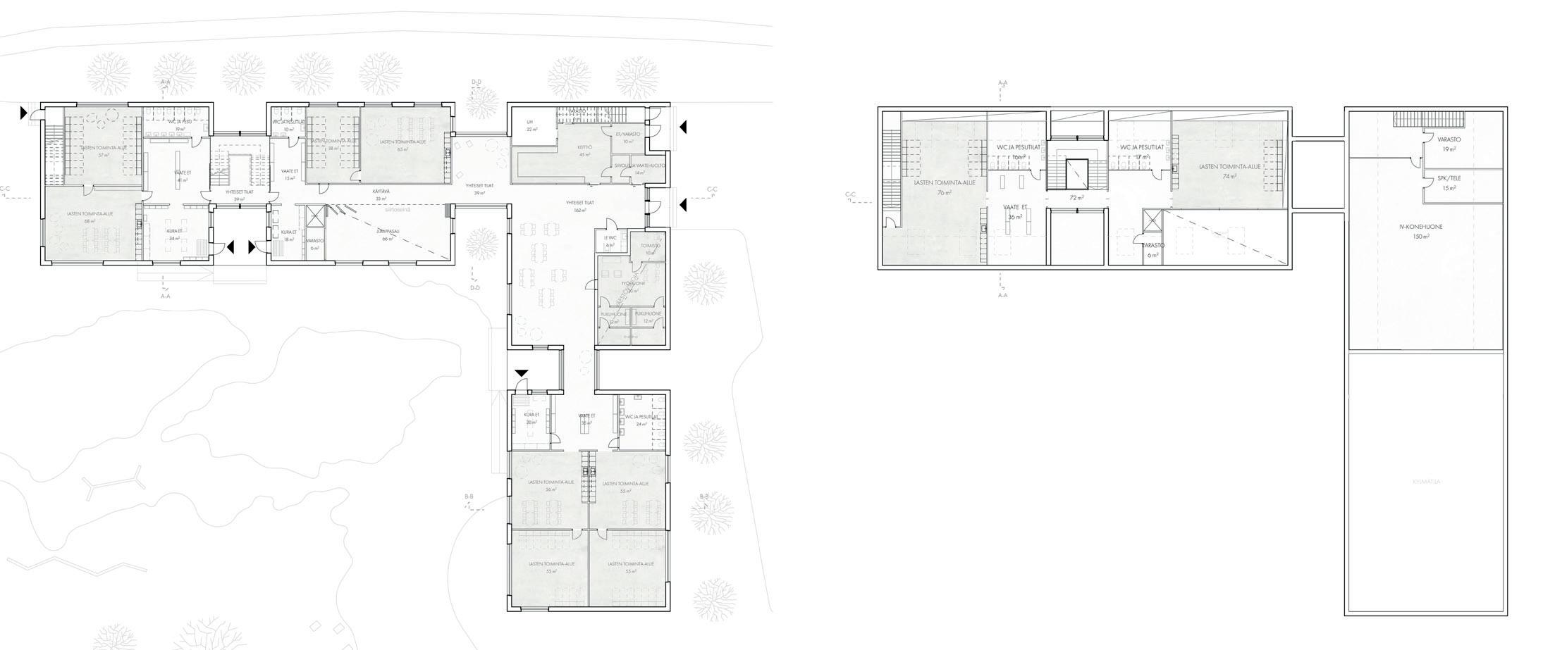 Rakennuksen ensimmäiseen kerrokseen sijoittuu keskeiset yhteisötilat: aula, monitoimitila, kahvila, tekijätila, ravintola, museokauppa, auditorio ja päänäyttelytila. Aulaan saavutaan rakennuksen länsi- ja itäpuolelta. Aula, kahvila sekä museokauppa ovat luontevasti yhteydessä toisiinsa. Myös tekijätila ja auditorio ovat aulan läheisyydessä. Lastaus ja pajatilat varastoineen sijoittuvat rakennuksen koilliseen kulmaan. Ravintola sijoittuu rakennuksen eteläpuolelle, josta sen suuret ikkunat avautuvat merelle päin. Museokierto on toteutettu niin että se alkaa luontevasti aulasta ja toisen kerroksen näyttelyiden kautta palaa takaisin aulaan missä on museokauppa ja kahvila. Rakennuksen toiseen kerrokseen sijoittuu museon vaihtuvien näyttelyiden tilat, yhteistyötoimijoiden ja työntekijöiden taukotilat sekä toimistot. Toimistoon sekä yhteistyötekijöiden tiloihin pääsee oman sisäänkäynnin kautta Linnanpuiston puoleisesta työntekijöille suunnatusta ovesta. Työntekijöille on tarjolla monipuolisesti omia työpisteitä ja hi jentymiseen suunnattuja tiloja.