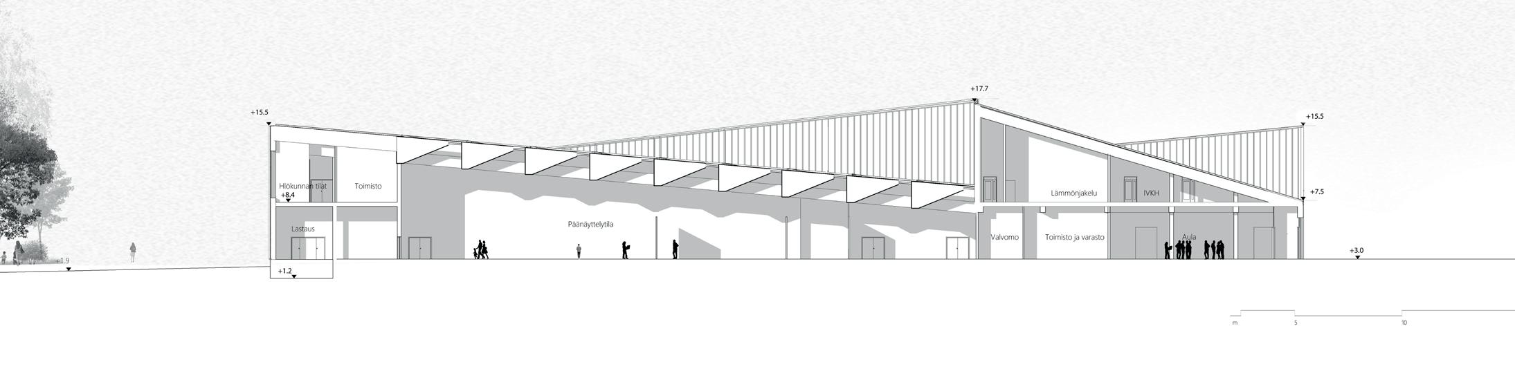 oitu sen kierrätetyssä julkisivulaudoituksessa, joka on valmistettu saha- ja höyläteollisuuden sivuvirroista ja hukkapuueristä. Myös rakennuksen kompaktius ja ylimääräisten hukkaneliöiden minimointi lisää rakennuksen resurssitehokkuutta. Kestävä historian ja tulevaisuuden museo hyödyntääkin sellaisia materiaaleja, jotka ovat uusiutuvia ja kestäviä pitkällä aikavälillä. Rakenteeltaan puinen museorakennus on ekologisuuden rohkea edelläkävijä.