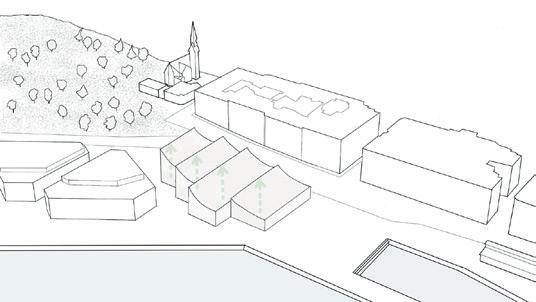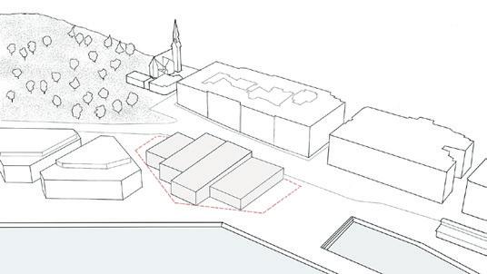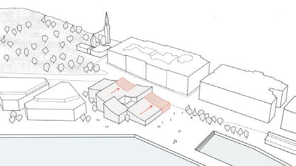 Rakennusmassat on jaettu tontille vanhojen satamarakennusten muotokielestä inspiroituneena.